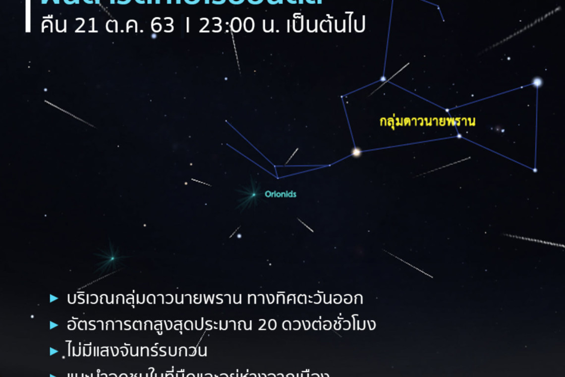 NARIT สถาบันวิจัยดาราศาสตร์แห่งชาติ โพสต์ผ่านเฟซบุ๊กชวนชมฝนดาวตกโอไรออนิดส์ คืนวันที่ 21 ต.ค.นี้ โดยระบุ "ฝนดาวตกโอไรออนิดส์" หรือฝนดาวตกกลุ่มดาวนายพราน จะเกิดขึ้นในช่วงวันที่ 2 ต.ค. - 7 พ.ย.ของทุกปี ปีนี้คาดว่ามีอัตราการตกสูงสุดในคืน 21 - 22 ต.ค.63 สามารถสังเกตเห็นตั้งแต่เวลาประมาณ 23.00 น. ของวันที่ 21 ต.ค.จนถึงรุ่งเช้าของวันที่ 22 ต.ค.63 มีศูนย์กลางการกระจายอยู่ทางทิศตะวันออก บริเวณแขนของกลุ่มดาวนายพราน อัตราการตกสูงสุดเฉลี่ยประมาณ 20 ดวงต่อชั่วโมง