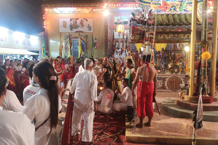 โดยเวลา 22.05 น. ได้มีการจุดประทัดรับพระเสียงดังกึกก้อง แล้วเปิดไฟฟ้าภายในศาลเจ้าและพิธี ตะเกียง 9 ดวงที่เชิญขึ้นบนเสาโกเต็ง หมายถึงดวงดาวในระบบสุริยะจักรวาลที่มีอิทธิพลต่อโลกมนุษย์และมนุษย์เรา เมื่ออันเชิญตะเกียงขึ้นสู่เสาเป็นที่เรียบร้อยต่อจากนั้นก็มีพิธีอันเชิญกระถางธูปใหญ่เข้าสู่โรงพิธี พร้อมทั้งพิธีรับพระอันยิ่งใหญ่ ในการประกอบพิธีจะต้องจุดประทัดจำนวนมาก เสียงประทัดดังกึกก้องทั้งศาลเจ้าและบริเวณใกล้เคียง