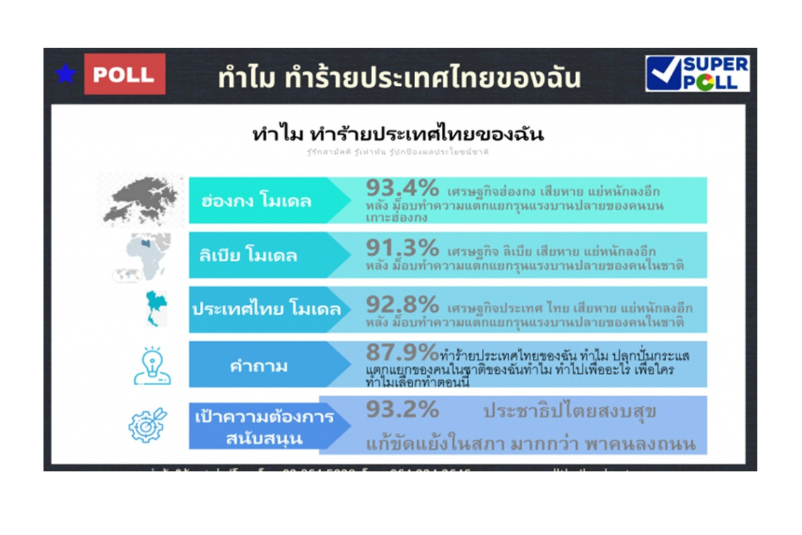 ซูเปอร์โพลชี้ผลสำรวจ 92.8%มองว่า ม็อบทำร้ายเศรษฐกิจประเทศเสียหาย
