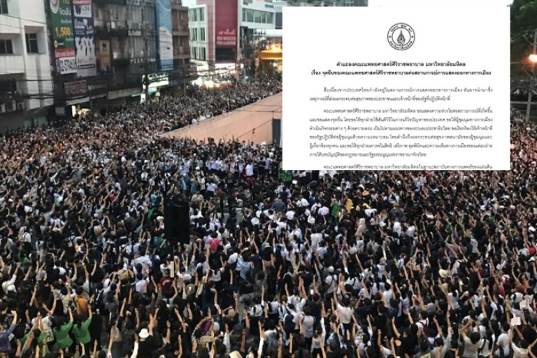 เมื่อวันที่ 20 ต.ค. 63 คณะแพทยศาสตร์ศิริราชพยาบาล มหาวิทยาลัยมหิดล ได้ประกาศแถลงจุดยืนคณะแพทยศาสตร์ศิริราชพยาบาล ต่อสถานการณ์การแสดงออกทางการเมือง โดยระบุ สืบเนื่องจากประเทศไทยกำลังอยู่ในสถานการณ์การแสดงออกทางการเมือง อันอาจนำมาซึ่งเหตุการณ์ที่ส่งผลกระทบต่อสุขภาพของประชาชนและเจ้าหน้าที่ของรัฐที่ปฏิบัติหน้าที่ คณะแพทยศาสตร์ศิริราชพยาบาล มหาวิทยาลัยมหิดล ขอแสดงความห่วงใยต่อสถานการณ์ที่เกิดขึ้น และขอแสดงจุดยืน โดยขอให้ทุกฝ่ายใช้สันติวิธีในการแก้ไขปัญหาของประเทศ ขอให้ผู้ชุมนุมทางการเมืองดำเนินกิจกรรมต่าง ๆ ด้วยความสงบ เป็นไปตามแนวทางของระบอบประชาธิปไตย ขอเรียกร้องให้เจ้าหน้าที่ของรัฐปฏิบัติต่อผู้ชุมนุมด้วยความเหมาะสม โดยคำนึงถึงผลกระทบต่อสุขภาพอนามัยของผู้ชุมนุมและผู้เกี่ยวข้องทุกคน และขอให้ทุกฝ่ายเคารพในสิทธิ เสรีภาพ ดุลพินิจและความเห็นทางการเมืองของแต่ละฝ่ายภายใต้บทบัญญัติของกฏหมายและรัฐธรรมนูญแห่งราชอาณาจักรไทย