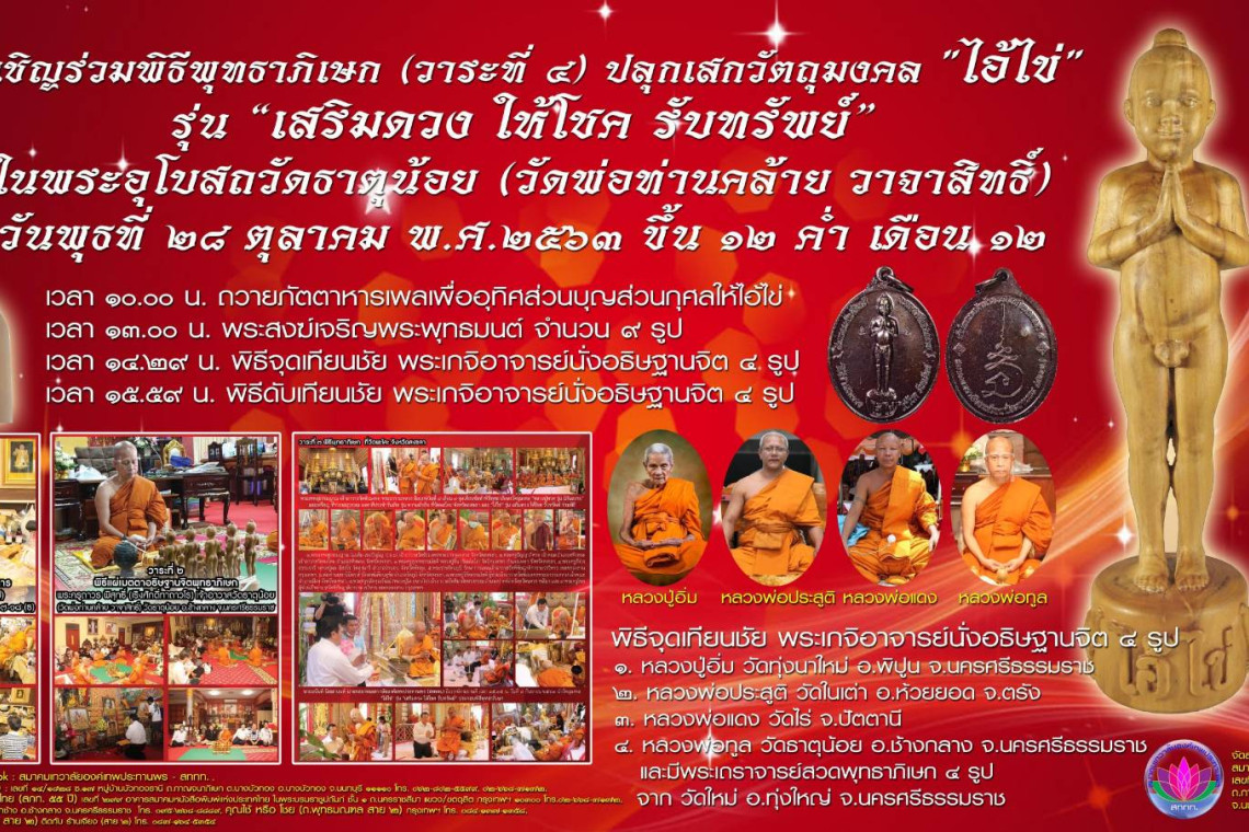ขอเชิญเรียนประชาชนทั่วไปร่วมพิธีดังกล่าว เพิ่มความเป็นสิริมงคล ในพระอุโบสถวัดธาตุน้อย...เสร็จจากพิธีพุทธาภิเษก แล้ว ท่านสามารถเช่าวัตถุมงคล "ไอ้ไข่" รุ่น เสริมดวง ให้โชค รับทรัพย์ ได้เลยทุกรายการหลังพิธีกรรมติดต่อสอบถามเข้าร่วมพิธีกรรม-เช่าวัตถุมงคล โทร. 062-802-5599/061-753-1199