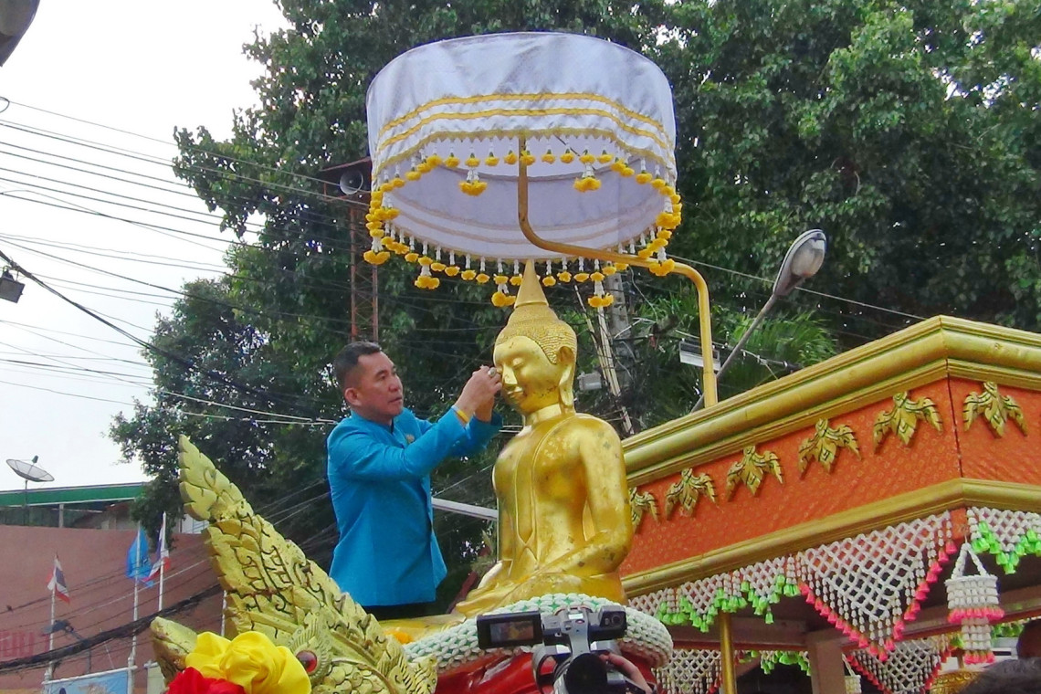 หลังกล่าวเปิดงานได้มีพิธีเจิมองค์พระปิดทองเบิกเนตรห่มสไบองค์จำลอง ซึ่งถูกนำมาประดิษฐานไว้บนรถนำขบวนแห่ เพื่อเตรียมเคลื่อนขบวนออกไปตามเส้นทาง มุ่งหน้าเข้าไปยังในชุมชน และตลาดเก่าภายในเขตเทศบาลเมืองฉะเชิงเทรา เพื่อให้ประชาชนได้ตั้งโต๊ะเครื่องบูชาสักการะ ขอพร จนถึงยังหน้าบ้านชานเรือน ร้านค้าของตนเองเพื่อเป็นสิริมงคลตามประเพณีท้องถิ่นดั้งเดิม