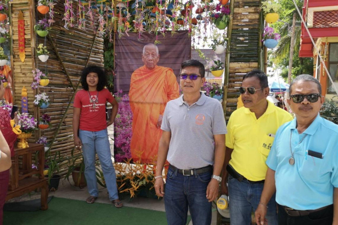 บรรยากาศภายในวัดมีการตกแต่งซุ้มด้วยกะลามะพร้าวทำโมบายปลาตะเพียน จำนวน 7,000 ลูก ความยาวประมาณ 100 เมตร และยังนำร่มสีสันสวยงามหลากสีมาประดับตกแต่งตั้งแต่ประตูทางเข้าวัด และมีซุ้มปิ่นโต ซุ้มกาบกล้วยชาวบ้านและผู้มีจิตศรัทธาได้ร่วมกันจัดทำขึ้น ที่เลือกใช้กะลามะพร้าวเพราะเป็นผลไม้อยู่ที่สูงและมีน้ำที่บริสุทธิ์ นำมาผูกติดกับปลาตะเพียนที่สื่อความหมายการมีชีวิตเพื่อเป็นสิริมงคลแก่ผู้ร่วมงาน นอกจากนี้ยังมีศิษย์ยานุศิษย์ได้ร่วมกันนำอาหารมาร่วมในงานให้ชาวบ้านได้กินฟรี บ้างก็มาช่วยล้างจาน อำนวยความสะดวกดูแลความปลอดภัยให้แก่ผู้ร่วมงาน พร้อมมีจุดคัดกรองก่อนเข้างานอีกด้วย
