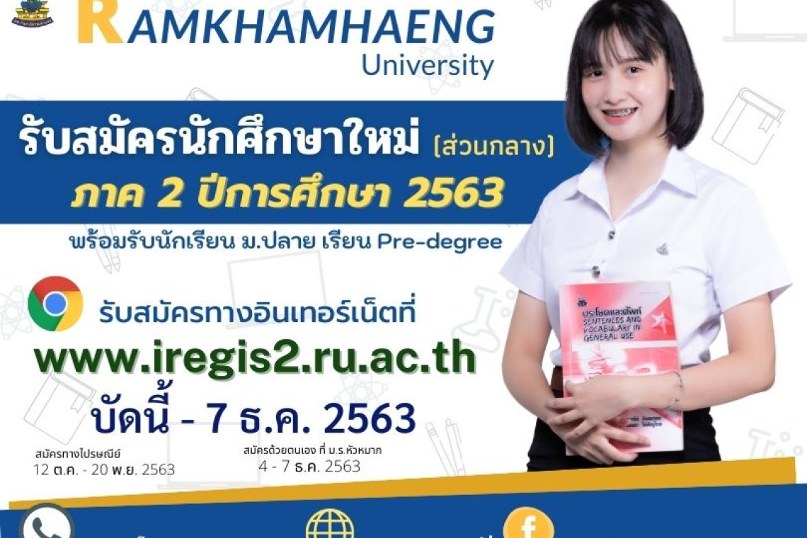 มหาวิทยาลัยรามคำแหง แจ้งเปิดรับสมัครนักศึกษาใหม่ระดับปริญญาตรี ภาค 2 ปีการศึกษา 2563 เฉพาะส่วนกลาง (หัวหมาก) สมัครด้วยตนเอง ระหว่างวันที่ 4 - 7 ธันวาคม 2563 (ทุกวัน) ณ อาคารหอประชุมพ่อขุนรามคำแหงมหาราช ม.ร. (หัวหมาก) และเปิดรับสมัครทางอินเทอร์เน็ตที่ www.iregis2.ru.ac.th ตั้งแต่บัดนี้ - 7 ธันวาคม 2563 และทางไปรษณีย์ ตั้งแต่บัดนี้ - 20 พฤศจิกายน 2563 รวมทั้งเปิดรับนักเรียนชั้นมัธยมศึกษาตอนปลายเข้าศึกษาในระบบ Pre-degree เพื่อสะสมหน่วยกิตล่วงหน้า โดยสามารถนำหน่วยกิตมาเทียบโอนได้เมื่อจบ ม.6 และยังเปิดโอกาสให้ผู้ที่ทำงานแล้วมีวุฒิอนุปริญญาได้ศึกษาเพิ่มเติม หรือเรียนปริญญาใบที่ 2 โดยสามารถเทียบโอนหน่วยกิตได้มากขึ้นทำให้สำเร็จการศึกษาเร็วขึ้น