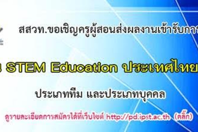 สสวท.เปิดคัดเลือก ครูดีเด่น STEM Education ประเทศไทย ดร.พรพรรณ ไวทยางกูร ผอ.สถาบันส่งเสริมการสอนวิทยาศาสตร์และเทคโนโลยี (สสวท.) แจ้งว่า สสวท.สังกัดกระทรวงศึกษาธิการ ขอเชิญครูที่มีผลงานด้านการจัดการเรียนรู้เชิงบูรณาการตามแนวทางสะเต็มศึกษา สมัครเข้ารับการคัดเลือกเป็นครูดีเด่น STEM Education ประเทศไทย โดยสมัครเข้ารับการคัดเลือกได้เพียงประเภทเดียว ได้แก่ ประเภทบุคคล ต้องเป็นครูผู้สอนวิทยาศาสตร์ คณิตศาสตร์ หรือเทคโนโลยีเท่านั้น หรือประเภททีม ต้องประกอบด้วย ครูผู้สอนในโรงเรียนเดียวกัน ทีมละ 2-4 คน ซึ่งอาจเป็นครูผู้สอนวิชาเดียวกันหรือต่างวิชาก็ได้แต่มากกว่าครึ่งหนึ่งของผู้ร่วมทีมจะต้องเป็นครูผู้สอนวิชาวิทยาศาสตร์ คณิตศาสตร์ หรือเทคโนโลยี ผู้สนใจสามารถดูรายละเอียดเพิ่มเติมและดาวน์โหลดเอกสารได้ที่เว็บไซต์ http://pd.ipst.ac.th ส่งใบสมัครพร้อมเอกสารประกอบภายในวันที่ 31 ส.ค.60