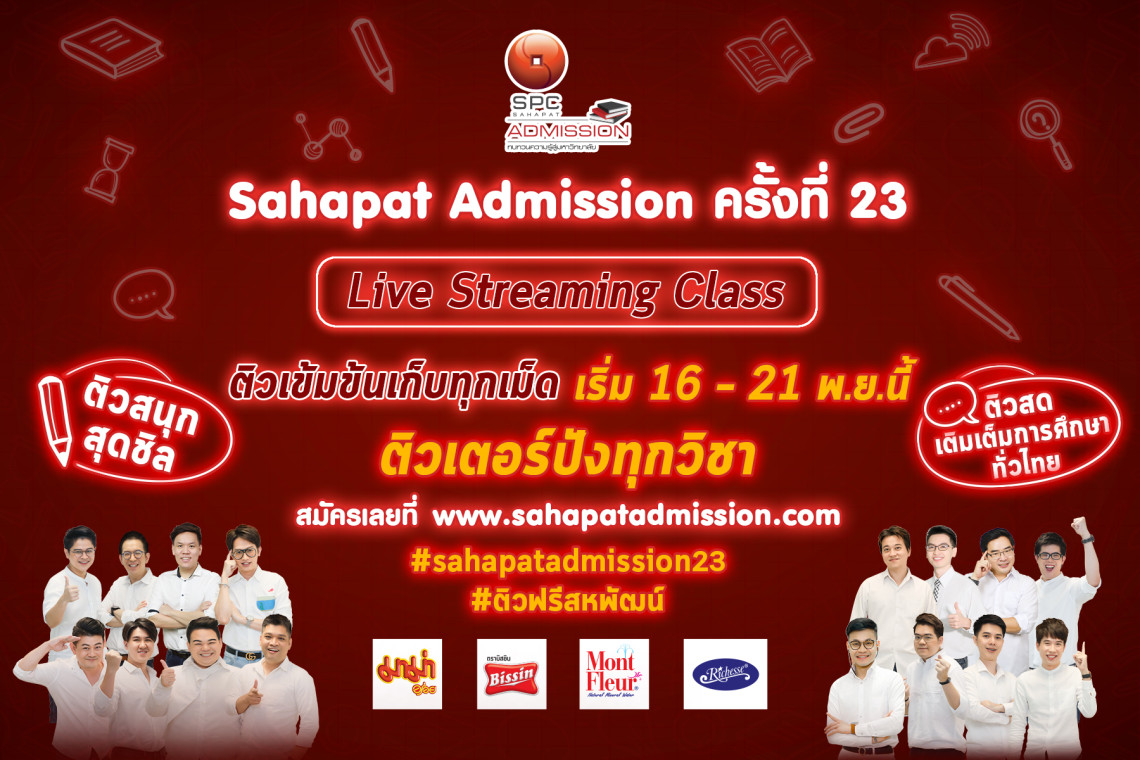 โครงการ “สหพัฒน์แอดมิชชั่น” ทบทวนความรู้สู่มหาวิทยาลัย ครั้งที่ 23 จัดโดย บริษัท สหพัฒนพิบูล จำกัด (มหาชน) ผลิตภัณฑ์ มาม่า บิสชิน มองต์เฟลอ และริชเชส เปิดรับสมัครติวเข้มออนไลน์ “Live Streaming Class ติวฟรีแบบใหม่ อยู่ไหนก็ติวได้” เฟส 2 ซึ่งจะจัดขึ้นในวันที่ 16-21 พฤศจิกายน 2563 โดยจะมีติวเตอร์และวิทยากรชื่อดังระดับประเทศมาถ่ายทอดเนื้อหาเข้มข้น เพื่อมอบความรู้ให้น้องๆ นักเรียนมัธยมศึกษาตอนปลาย และสามารถนำสอบเข้ามหาวิทยาลัยที่ต้องการศึกษาต่อได้สำเร็จ