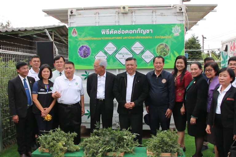 ศ.ดร.มนต์ชัย ดวงจินดา รองอธิการบดี มข. กล่าวว่า ดอกกัญชาที่ครบกำหนดตัดในวันนี้ เป็นส่วนหนึ่งของการศึกษาวิจัยการประเมินสายพันธ์กัญชา เพื่อการแพทย์และอุตสาหกรรมที่เกี่ยวข้อง ซึ่งได้รับอนุญาตในการผลิตและปลูกในชุดแรก ซึ่งมหาวิทยาลัยขอนแก่นเป็นที่แรกที่ได้รับอนุญาติให้ปลูกกัญชาเพื่อการศึกษาวิจัย จำนวนพื้นที่ในการปลูก 20 ตารางเมตร โดยได้ปลุกมาตั้งแต่เดือน เม.ย. 2563 ที่ผ่านมาและครบกำหนดตัดช่อดอกในวันนี้ ซึ่งคณะทำงานจะทำการเก็บไปเพื่อประเมินสานพันธุ์และพัฒนาสายพันธุ์ที่เหมาะสมในการนำไปใช้ทางการแพทย์ต่อไป