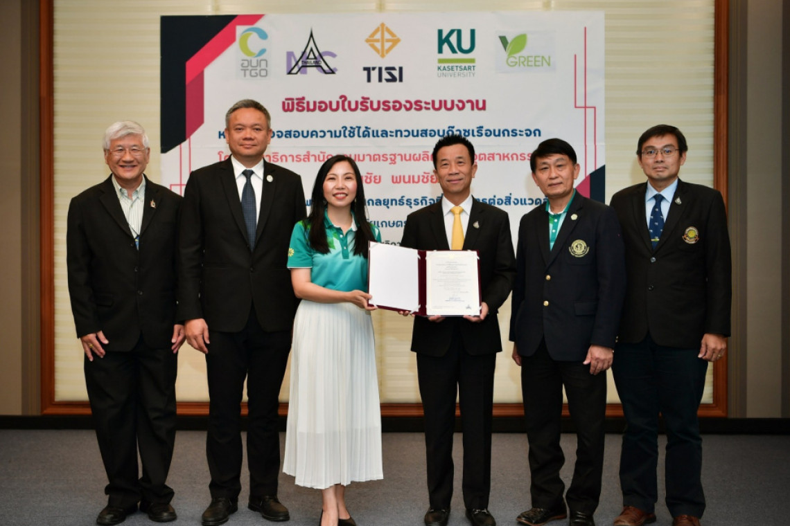 เมื่อวันที่ 4 พ.ย. ผศ.ดร.รัตนาวรรณ มั่งคั่ง ผู้อำนวยการศูนย์เชี่ยวชาญเฉพาะทางด้านกลยุทธ์ธุรกิจที่เป็นมิตรต่อสิ่งแวดล้อม ( VGREEN) มหาวิทยาลัยเกษตรศาสตร์ รับมอบใบรับรองระบบงาน : หน่วยตรวจสอบความใช้ได้และทวนสอบ (Validation/Verification Body, VVB) ก๊าซเรือนกระจก มอก.14065-2560 หรือ ISO 14065 : 2013 ในขอบข่ายการทวนสอบคาร์บอนฟุตพริ้นขององค์กร และขอบข่ายการตรวจสอบความใช้ได้และทวนสอบก๊าซเรือนกระจกระดับโครงการลดก๊าซเรือนกระจกภาคสมัครใจตามมาตรฐานของประเทศไทย ขององค์การบริหารจัดการก๊าซเรือนกระจก (องค์การมหาชน) จากนายวันชัย พนมชัย เลขาธิการสำนักงานมาตรฐานผลิตภัณฑ์อุตสาหกรรม (สมอ.) โดยมี นายเอกนิติ รมยานนท์ ผู้อำนวยการสำนักงานคณะกรรมการการมาตรฐานแห่งชาติ นางสาว วัฒนาพร ฉิมเรศ ผู้อำนวยการกลุ่มรับรองหน่วยรับรอง ดร.พงษ์วิภา หล่อสมบูรณ์ รองผู้อำนวยการ องค์การบริหารจัดการก๊าซเรือนกระจก (องค์การมหาชน) ดร.พฤฒิภา โรจน์กิตติคุณ ผอ.สำนักประเมินและรับรองโครงการ องค์การบริหารจัดการก๊าซเรือนกระจก (องค์การมหาชน) ผศ.ดร.นิคม แหลมสัก รองอธิการบดีฝ่ายนวัตกรรมและกิจการเพื่อสังคม มหาวิทยาลัยเกษตรศาสตร์ (มก.) ผศ.ดร.สุรัตน์ บัวเลิศ คณบดีคณะสิ่งแวดล้อม มก. และ ผศ.ดร.กอบศักดิ์ วันธงไชย รองคณบดีฝ่ายวิจัยและทรัพยากรมนุษย์ คณะวนศาสตร์ มก. ร่วมแสดงความยินดี ณ ห้องประชุม 200 อาคาร สมอ.