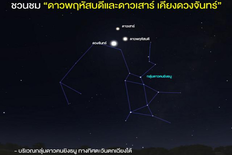 ชมได้หลังตะวันลับขอบฟ้า ทางทิศตะวันตกเฉียงใต้ ถึง 3 ทุ่ม ชี้เป็นปรากฏการณ์ทางดาราศาสตร์ที่เกิดเป็นประจำตามแนวสุริยะวิถี NARIT สถาบันวิจัยดาราศาสตร์แห่งชาติ โพสต์ผ่านเฟซบุ๊กระบุ คืน 19 พ.ย. นี้ ชวนชม #ดาวเคียงเดือน และ #ดาวเคราะห์ชุมนุม คืนวันที่ 19 พ.ย. 63 จะเกิดปรากฏการณ์ “ดาวเคียงเดือน” ดาวพฤหัสบดีปรากฏเคียงดวงจันทร์ ใกล้กันมากที่สุด 3 องศา เวลา 18.40 น. นอกจากนี้ ยังมีดาวเสาร์ปรากฏเคียงดวงจันทร์เช่นกัน ห่าง 4.2 องศา และในขณะเดียวกันดาวเสาร์และดาวพฤหัสบดี ปรากฏบนท้องฟ้าห่างกัน 3.2 องศา เรียกปรากฏการณ์นี้ว่า “ดาวเคราะห์ชุมนุม” สังเกตได้หลังดวงอาทิตย์ลับขอบฟ้าเป็นต้นไป ทางทิศตะวันตกเฉียงใต้ บริเวณกลุ่มดาวคนยิงธนู (Sagittarius) จนถึงเวลาประมาณ 21.00 น. ปรากฏการณ์ “ดาวเคียงเดือน” และ “ดาวเคราะห์ชุมนุม” ถือเป็นปรากฏการณ์ทางดาราศาสตร์หนึ่งที่เกิดขึ้นเป็นประจำ เนื่องจากดวงจันทร์และดาวเคราะห์เปลี่ยนตำแหน่งบนท้องฟ้าไปเรื่อย ๆ ตามแนวสุริยะวิถี ดังนั้น การที่ดวงจันทร์และดาวเคราะห์ปรากฏบนท้องฟ้าในทิศเดียวกัน หรือเคลื่อนที่มาอยู่ในตำแหน่งใกล้เคียงกันจึงถือเป็นเรื่องปกติ ที่สามารถอธิบายได้ตามหลักการทางวิทยาศาสตร์