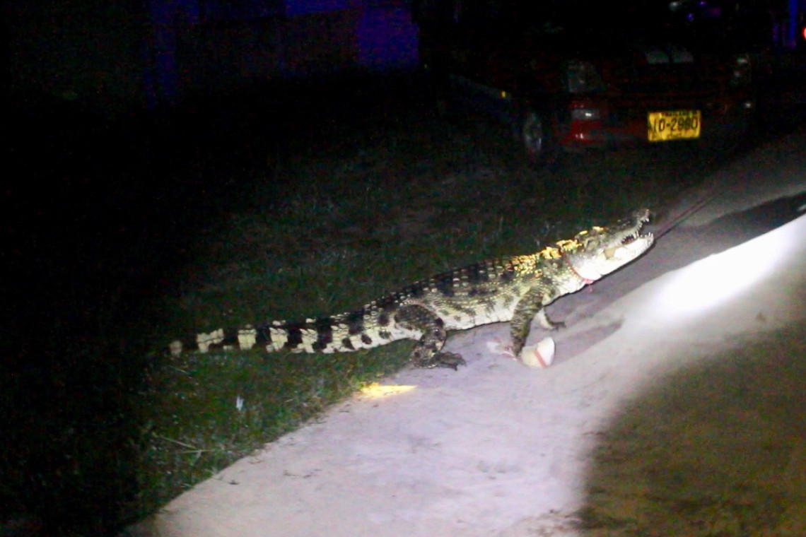สถานที่เกิดเหตุภายในบ้านเลขที่ 29 ม.7 บ.กระวัน ต.หนองใหญ่ อ.ปราสาท จ.สุรินทร์ ทราบชื่อเจ้าของบ้านคือ นายกร อยู่ดีรัมย์ อายุ 52 ปี จากการสอบถามเล่าว่าตนเองได้ตื่นขึ้นมาเข้าห้องน้ำที่อยู่นอกตัวบ้านขณะทำธุระในห้องน้ำเสร็จสิ้นได้ยืนกินน้ำบริเวณเตียงนั่งเล่นหน้าบ้านจู่ๆได้ยินเสียงคลายคนเปิดก๊อกน้ำแต่ตนเองไม่ได้เอะใจขณะกำลังเดินจะเข้าไปในบ้านได้ยินเสียงขู่ดังขึ้นเรื่อยๆตนจึงได้ชะโงกไปดูพบจระเข้ตัวขนาดใหญ่กำลังนอนอ้าปากค้างตนตกใจจึงได้วิ่งไปตามญาติที่อยู่บ้านติดกันให้มาช่วยดูหลังจากนั้นจึงได้รีบโทรแจ้งขอความช่วยเหลือจากศูนย์กู้ชีพปราสาท 1669 และเจ้าหน้าที่หน่วยกู้ภัยสว่างจรรยาธรรมบุรีรัมย์ จุด อ.ปราสาท ให้เร่งรีบเข้ามาตรวจสอบให้การช่วยเหลือเป็นการเร่งด่วน