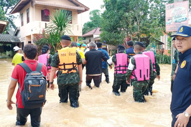 รมช.มหาดไทยและแม่ทัพภาค 4 ลงพื้นที่ช่วยเหลือชาวบ้านบ้านน้ำลัด อ.สะเดา ที่ถูกน้ำป่าไหลเข้าท่วม พร้อมสั่งการทุกจังหวัดเตรียมพร้อมรับมือน้ำท่วมในระยะนี้เพื่อให้การช่วยเหลือประชาชนโดยเร็วที่สุด วันนี้(22พ.ย.63)ความคืบหน้าเหตุน้ำป่าไหลหลากเข้าท่วมในพื้นที่บ้านน้ำลัด หมู่ 2 ต.สำนักแต้ว อ.สะเดา จ.สงขลา จากฝนที่ตกสะสมมาตั้งแต่เมื่อวานนี้ ล่าสุด นายนิพนธ์ บุญญามณี รัฐมนตรีช่วยว่าการกระทรวงมหาดไทยและ พล.ท.เกรียงไกร ศรีรักษ์ แม่ทัพภาคที่ 4 พร้อมหน่วยงานที่เกี่ยวข้องได้ลงพื้นที่ติดตามสถานการณ์และให้การช่วยเหลือชาวบ้านที่ได้รับผลกระทบ ซึ่งเบื้องต้นได้มีการแจกถุงยังชีพให้กับชาวบ้านที่บ้านเรือนถูกน้ำท่วม และกำลังทหารได้เข้าไปช่วยยกและเคลื่อนย้ายทรัพย์สินของชาวบ้านไปอยู่ในที่ปลอดภัย แต่สถานการณ์ขณะนี้เริ่มคลี่คลายไปในทางที่ดีขึ้นหากไม่มีฝนตกมาซ้ำ นายนิพนธ์ กล่าวว่า ได้สั่งการให้หน่วยงานที่เกี่ยวข้องเร่งให้การช่วยเหลือชาวบ้านที่ได้รับผลกระทบโดยเร็วที่สุดและให้ทุกจังหวัดเตรียมพร้อมรับสถานการณ์น้ำท่วมในระยะนี้รวมทั้งเตรียมสถานที่อพยพชาวบ้านให้พร้อม ด้านพล.ท.เกรียงไกร ศรีรักษ์ แม่ทัพภาคที่ 4 เปิดเผยว่า ได้ส่งทหารมาช่วยเหลือชาวบ้านน้ำลัดตั้งแต่เมื่อคืนนี้สถานการณ์ตอนนี้ยังไม่ถึงขั้นอพยพชาวบ้านออกนอกพื้นที่หากไม่มีฝนตกซ้ำสถานการณ์น่าจะดีขึ้น ซึ่งในส่วนของกองทัพภาค4 พร้อมให้การช่วยเหลือประชาชนได้ทีนทีทุกพื้นที่หากเกิดน้ำท่วมตามที่ได้มีการซักซ้อมและประสานงานกันของทุกหน่วยเอาไว้แล้ว