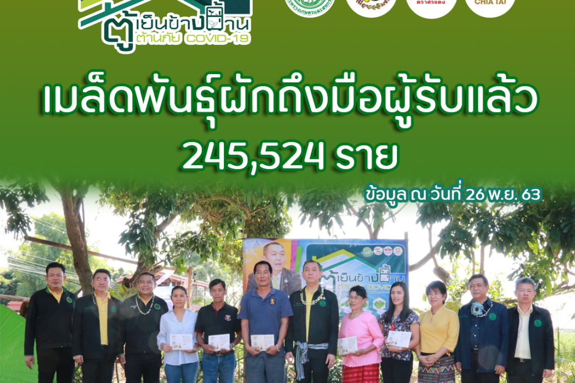 เมื่อวันที่ 30 พ.ย. ดร.เฉลิมชัย ศรีอ่อน รัฐมนตรีว่าการกระทรวงเกษตรและสหกรณ์ เปิดเผยผลการส่งมอบเมล็ดพันธุ์พืชผักสวนครัวภายใต้โครงการตู้เย็นข้างบ้านต้านภัย COVID– 19 ที่ลงทะเบียนผ่านทางเว็บไซต์ ซึ่งกลุ่มเพื่อนเฉลิมชัย ร่วมกับกระทรวงเกษตรและสหกรณ์ โดยกรมส่งเสริมการเกษตร บริษัท อีสท์ เวสท์ ซีด จำกัด, บริษัท เจียไต๋ จำกัด ร่วมให้การสนับสนุนเมล็ดพันธุ์พืชผักสวนครัวให้กับเกษตรกรและประชาชนทั่วไป จำนวน 300,000 ชุด ใช้ปลูกบริโภคในครัวเรือน เพื่อบรรเทาความเดือดร้อนจากสถานการณ์การแพร่ระบาดของโรคติดเชื้อไวรัสโคโรนา 2019 (COVID-19)