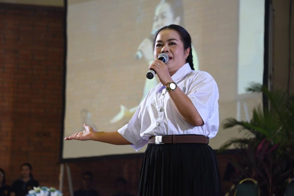 โดย "ตุ๊กกี้" ได้เปิดตัวด้วยผลงานเพลงผู้สาวขาเลาะ เพื่อสร้างสีสันและความบันเทิง ให้กับนิสิตใหม่ได้มีความสุขและเสียงหัวเราะ จากนั้นได้ให้ข้อคิดเห็นจากประสบการณ์ตรงที่ได้ศึกษาในมหาวิทยาลัยมหาสารคาม ในช่วงปี 2541-2544 โดย "ตุ๊กกี้" กล่าวว่า ทุกคนโชคดีที่มีโอกาสได้ศึกษาต่อในระดับมหาวิทยาลัย การศึกษาขึ้นอยู่กับตัวผู้เรียนสำคัญที่สุด และขอฝากข้อคิดไว้ให้น้องๆ ได้มีความรักไว้ 3 ข้อ