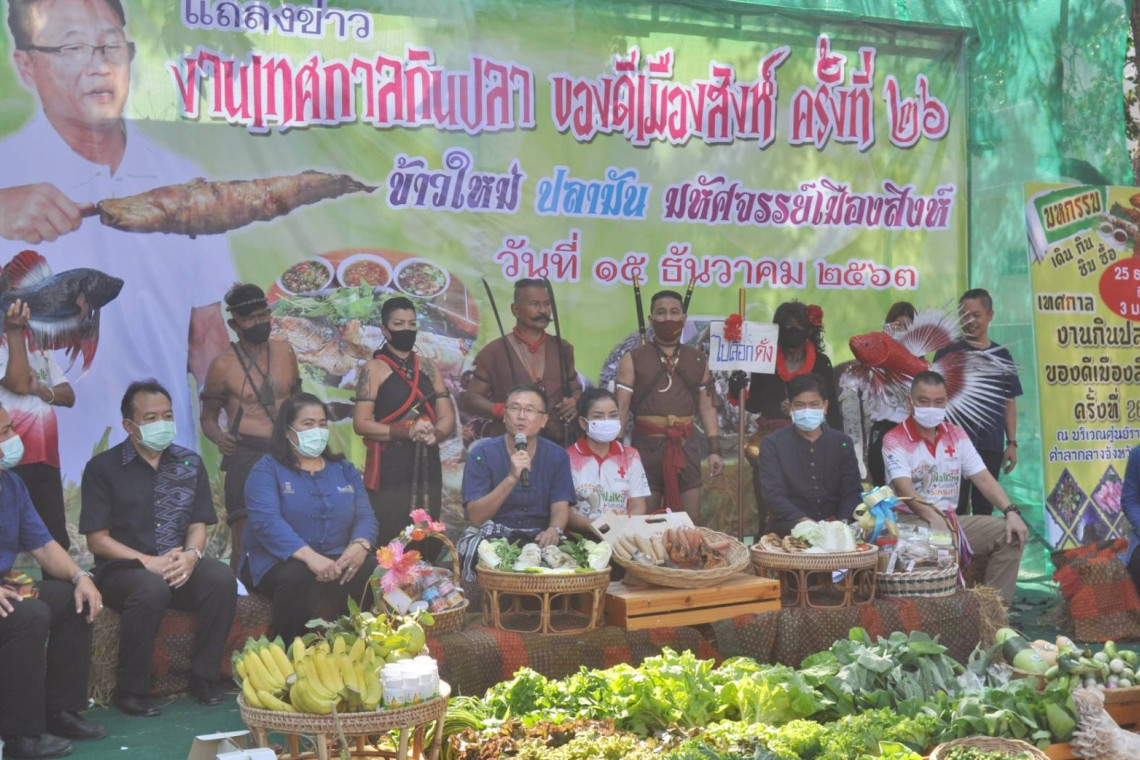 วันที่ 15 ธันวาคม 2563 จังหวัดสิงห์บุรี โดยสำนักงานประชาสัมพันธ์จังหวัดสิงห์บุรี ได้จัดงานแถลงข่าวการจัดงานเทศกาลกินปลาของดีเมืองสิงห์บุรี ครั้งที่ 26 ขึ้นที่บริเวณตลาด ประชารัฐ ศาลากลางจังหวัดสิงห์บุรี อำเภอเมือง จังหวัดสิงห์บุรี โดยมีนายชำนาญวิทย์ เตรัตน์ ผู้ว่าราชการจังหวัดสิงห์บุรี เป็นประธานในการแถลงข่าว นางชุลีพร เตรัตน์ นายกเหล่ากาชาดจังหวัดสิงห์บุรี นายณัฐวุฒิ ถุนนอก ปลัดจังหวัดสิงห์บุรี นายกู้เกียรติ นิ่มเนียม ท้องถิ่นจังหวัดสิงห์บุรี และผู้ที่เกี่ยวข้อง ร่วมให้ข้อมูลการแถลงข่าว
