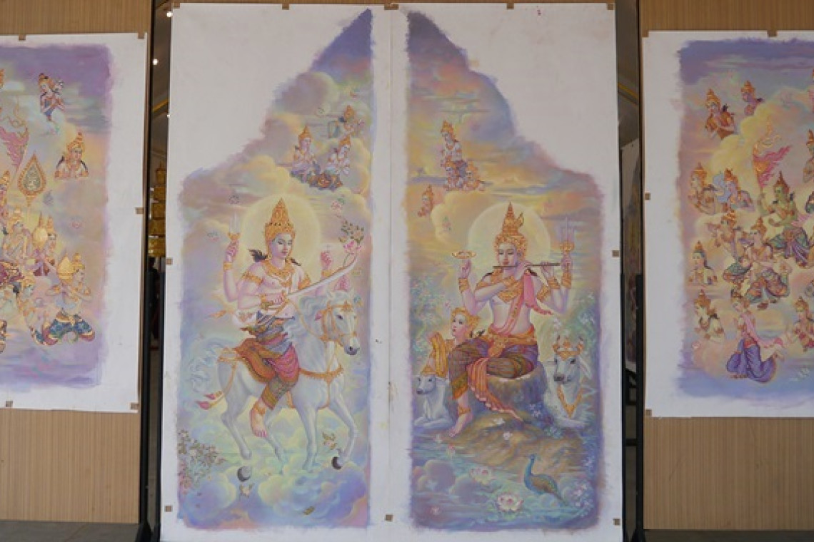 เกียรติศักดิ์ สุวรรณพงศ์ จิตรกรชำนาญการพิเศษ สำนักช่างสิบหมู่ กล่าวภาพรวมจิตรกรรมฉากบังเพลิงว่า คืบหน้า 80 เปอร์เซ็นต์ อย่างภาพเขียนฉากด้านทิศตะวันตก ด้านหน้าแสดงเรื่องราวพระนารายณ์ปางกฤษณาวตาร ทรงอวตารเป็นพระกฤษณะ และปางกัลกยาวตาร ทรงอวตารเป็นมนุษย์ขี่ม้าขาว พร้อมกับภาพล่างแสดงเรื่องราวโครงการพระราชดำริหมวดลม เสร็จสมบูรณ์แล้ว เหลือเพียงขั้นตอนประกอบเข้ากับฉากจริง