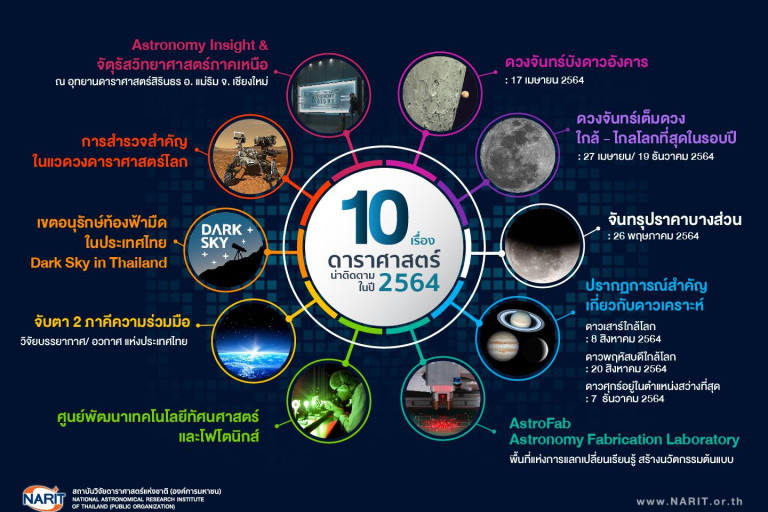 NARIT สถาบันวิจัยดาราศาสตร์แห่งชาติ โพสต์ผ่านเฟซบุ๊กระบุ เปิดโผ 10 เรื่องดาราศาสตร์น่าติดตาม ประจำปี 2564 โดยว่า ปี 2564 นี้นอกเหนือจาก #ปรากฏการณ์ดาราศาสตร์ ที่น่าสนใจแล้ว ยังมีเรื่องของ #เทคโนโลยีดาราศาสตร์ ที่จะเริ่มเข้ามามีบทบาทมากขึ้น ทั้งการพัฒนาขีดความสามารถของบุคลากรไทย ยกระดับงานวิจัยและเทคโนโลยีภายในประเทศ ตลอดจนสร้างแรงบันดาลใจด้านวิทยาศาสตร์ให้กับเยาวชน