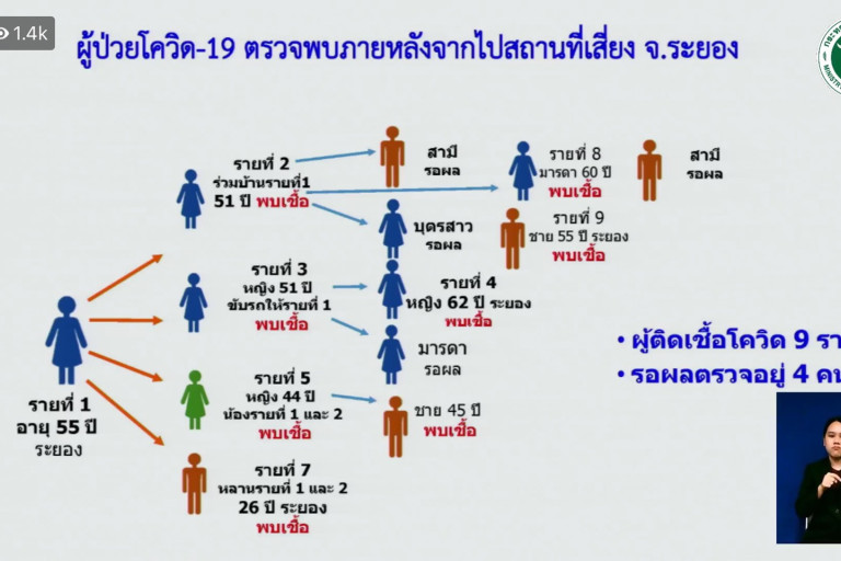 26 ธ.ค.2563 ที่กระทรวงสาธารณสุข นพ.โอภาส การย์กวินพงศ์ อธิบดีกรมควบคุมโรค เปิดเผยว่า มีรายงานเบื้องต้นพบผู้ติดเชื้อโควิด-19 เพิ่มอีก 9 ราย และรอยืนยันผลจากผู้สัมผัสใกล้ชิดที่เสี่ยงสูง ซึ่งเป็นคนในครอบครัว อีก 4 ราย โดยผู้ป่วยรายที่ 1 เป็นหญิงอายุ 55 ปี ผู้ป่วยรายที่ 2 เป็นหญิงอายุ 51 ปี ร่วมบ้านกับผู้ป่วยรายที่ 1 ผู้ป่วยรายที่ 3 เป็นหญิงอายุ 51 ปี ขับรถให้ผู้ป่วยรายที่ 1 ผู้ป่วยรายที่ 4 เป็นหญิงอายุ 62 ปี ผู้ป่วยรายที่ 5 เป็นหญิงอายุ 44 ปี น้องของผู้ติดเชื้อรายที่ 1 และ 2 ผู้ป่วยรายที่ 6 เป็นชายอายุ 45 ปี ผู้ป่วยรายที่ 7 เป็นชายอายุ 26 ปี หลานของผู้ป่วยรายที่ 1 และ 2 ผู้ป่วยรายที่ 8 เป็นหญิงอายุ 60 ปี ผู้ป่วยรายที่ 9 เป็นชายอายุ 55 ปี