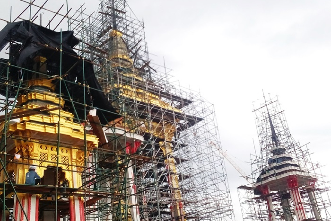 ความคืบหน้าการก่อสร้างพระเมรุมาศ และสิ่งปลูกสร้างอาคารประกอบพระเมรุมาศ งานพระราชพิธีถวายพระเพลิงพระบรมศพพระบาทสมเด็จพระปรมินทรมหาภูมิพลอดุลยเดช นายเจษฎา ชีวะวิชวาลกุล หัวหน้ากลุ่มวิศวกรรมสำนักสถาปัตยกรรม กรมศิลปากร กล่าวว่า การจัดสร้างพระเมรุมาศ และสิ่งปลูกสร้างอาคารประกอบพระเมรุมาศ มีความคืบหน้าไปตามลำดับ โดยในส่วนของพระเมรุมาศเตรียมงานกระดาษทองย่น รวมถึงมีการปรับหน้าดินและปูพื้นบริเวณด้านหน้าพระที่นั่งทรงเต็มพื้นที่แล้ว ส่วนอีกด้านยังไม่ได้ดำเนินการ เพราะต้องเปิดทางไว้สำหรับรถขนส่งอุปกรณ์เข้าออก สำหรับอาคารประกอบอื่นๆ เช่น พระที่นั่งทรงธรรม เข้าสู่งานประดับผ้าทองย่น ทับเกษตร ทิม ศาลาลูกอยู่ระหว่างเก็บรายละเอียดงานสถาปัตยกรรม อย่างไรก็ตามในช่วงนี้ถือว่าอยู่ระหว่างการทำงานด้านภูมิสถาปัตยกรรม โดยสระอโนดาตโครงสร้างทั้ง 4 มุมเสร็จเรียบร้อยแล้ว ทดลองพ่นสีฟ้า เตรียมนำศิลปกรรมสัตว์หิมพานต์มาติดตั้ง ขณะที่ทางสวนนงนุชเริ่มเข้ามาดูพื้นที่เพื่อเตรียมต้นไม้ประดับพระเมรุมาศ ทางกรมการข้าวได้เข้าให้คำแนะนำในการเตรียมจัดทำแปลงนาข้าว ภาพ...เจ้าหน้าที่สำนักสถาปัตยกรรมและช่างสิบหมู่ ดำเนินการลงสีทองซ่างและองค์ประธานพระเมรุมาศ