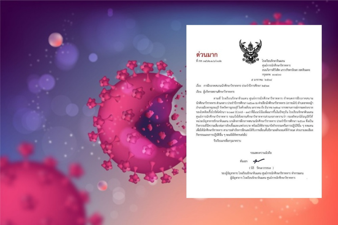 จากสถานการณ์แพร่ระบาดโรคโควิด-19 ที่มีแนวโน้มเพิ่มขึ้นในปัจจุบัน โรงเรียนรักษาดินแดน ศูนย์การนักศึกษาวิชาทหาร ขอแจ้งให้สถานศึกษาวิชาทหารส่วนกลางทราบว่า กองทัพบกได้อนุมัติให้หน่วยบัญชาการรักษาดินแดนยกเลิกการฝึกภาคสนามนักศึกษาวิชาทหาร ประจำปีการศึกษา 2563 ซึ่งเป็นกิจกรรมที่มีความเสี่ยงต่อการติดเชื้อและแพร่ระบาด พร้อมให้พิจารณาจัดกิจกรรม หรือการปฏิบัติอื่นๆ ทดแทน เพื่อให้นักศึกษาวิชาทหารสามารถฝึกและได้รับการเลื่อนชั้นปีตามเกณฑ์ที่กำหนด