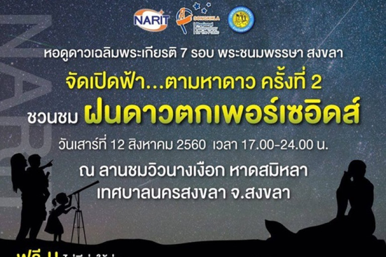 นายเฉลิมชนม์ วรรณทอง ผอ.หอดูดาวเฉลิมพระเกียรติ 7 รอบพระชนมพรรษา สงขลา เปิดเผยถึงกิจกรรมเปิดฟ้าตามหาดาว "ชวนแม่ชมฝนดาวตกเฟอร์เซอิดส์" หรือ ฝนดาวตกวันแม่ วันเสาร์ที่ 12 สิงหาคม 2560 เวลา 17.00-24.00 น. ณ ลานชมวิวนางเงือก หาดสมิหลา จ.สงขลา ว่า ตามที่สถาบันวิจัยดาราศาสตร์แห่งชาติ (องค์การมหาชน) หรือ สดร. กระทรวงวิทยาศาสตร์และเทคโนโลยี ซึ่งเป็นหน่วยงานที่ดำเนินงานด้านดาราศาสตร์ของประเทศ เล็งเห็นความสำคัญของการส่งเสริมบรรยากาศการเรียนรู้ด้านดาราศาสตร์ โดยเฉพาะการทำกิจกรรมเพื่อบริการความรู้ เป็นเเหล่งช่วยเผยเเพร่ความรู้ความสนใจในเรื่องดังกล่าวในระดับโรงเรียนเเละท้องถิ่น จึงได้จัดกิจกรรมด้านดาราศาสตร์ขึ้น ณ หอดูดาวเฉลิมพระเกียรติ 7 รอบพระชนมพรรษา สงขลา ซึ่งเป็นศูนย์กลางการกระจายความรู้ดาราศาสตร์อีกเเห่งหนึ่งของ สดร. รวมถึงเป็นศูนย์กลางการเรียนรู้เเก่ครู อาจารย์ นักเรียน นักศึกษาเเละประชาชนทั่วไปในเขตพื้นที่ภาคใต้เเละพื้นที่ใกล้เคียง