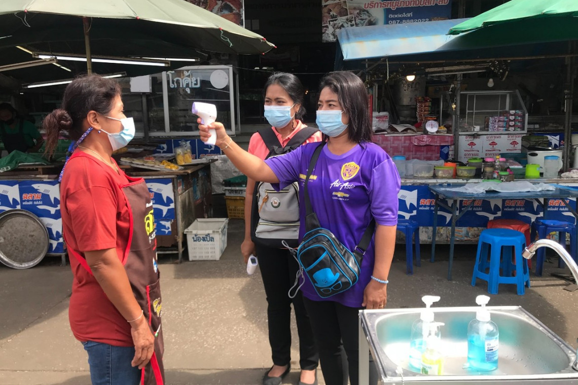 3. จัดจุดทำความสะอาดมือและเจลแอลกอฮอล์ล้างมือให้ผู้ค้าและผู้ที่มาซื้อของในตลาด เพื่อบริการผู้ค้าและผู้ซื้อทั้งก่อนและหลังเข้าตลาดและขอความร่วมมือให้มีการแสกนคิวอาร์โค้ดผ่านแอปพลิเคชั่นไทยชนะ 4. กำหนดระยะห่างระหว่างผู้ค้ากับผู้ซื้อประมาณ 1- 2 เมตร 5. กำชับผู้ค้าช่วยกันทำความสะอาดพื้นที่ตลาด