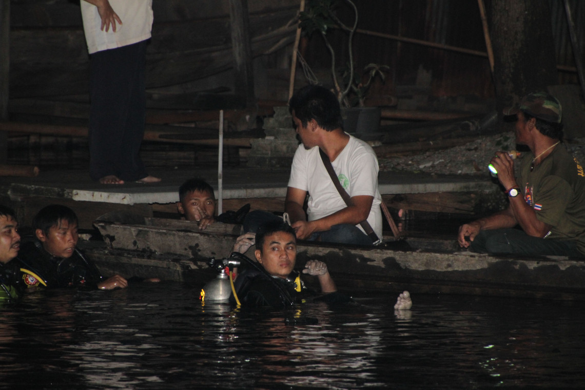 ที่เกิดเหตุบริเวณคลองประเวศบุรีรมย์ เจ้าหน้าที่ชุดประดาน้ำ 3 ชุด จำนวน 15 คน แบ่งพื้นที่ในการค้นหาเป็นแนวหน้ากระดาน โดยใช้เวลาในการค้นหาประมาณ 20 นาที พบศพ ด.ต.สรรลักษณ์ สิงห์สุพรรณ เจ้าหน้าที่ตำรวจชุดปฏิบัติการปราบปรามยาเสพติด กองบังคับการตำรวจนครบาล 3 สภาพสวมเสื้อกีฬาสีดำ-แดง กางเกงยีนขายาวสีเทา อยู่ใกล้ตลิ่งห่างจากจุดที่กระโดดไปประมาณ 20 เมตร ขณะเดียวกันเจ้าหน้าที่ชุดประดาน้ำ ก็ได้ทำการงมค้นหาผู้ต้องหาที่สูญหายต่อไป