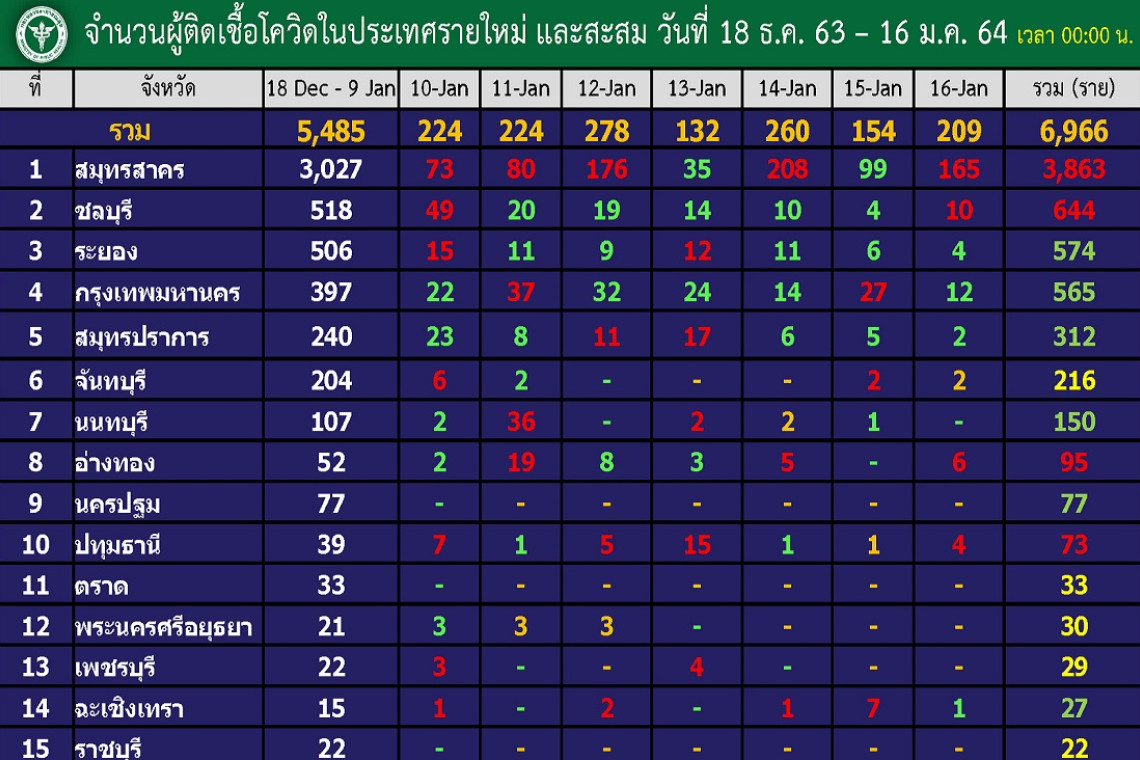 สมุทรสาครยังนำโด่งใกล้แตะ 4 พัน รายใหม่กทม.เพิ่มเป็นอันดับ 2 ตามด้วยเมืองชลฯ นนท์วันนี้ไม่มีป่วยเพิ่ม รวมทั้งนครปฐมที่ 1 สัปดาห์แล้วไม่พบผู้ติดเชื้อใหม่ กรมควบคุมโรค กระทรวงสาธารณสุข เผยจำนวนผู้ติดเชื้อโควิด-19 ในประเทศไทยรายใหม่และสะสม ตั้งแต่วันที่ 18 ธ.ค.63-16 ม.ค.64 โดยข้อมูลล่าสุดเมื่อวันที่ 16 ม.ค.64 เวลา 00.00 น. 10 อันดับจังหวัดพบผู้ติดเชื้อโควิดสูงสุด ประกอบด้วย 1.สมุทรสาคร รายใหม่เพิ่มอีก 165 ยอดรวม 3,863 ราย 2.ชลบุรี เพิ่มอีก 10 ยอดรวม 644 ราย 3.ระยอง เพิ่มอีก 4 ยอดรวม 574 4.กทม. เพิ่มอีก 12 ยอดรวม 565 5.สมุทรปราการ เพิ่มอีก 2 ยอดรวม 312 6.จันทบุรี เพิ่มอีก 2 ยอดรวม 216 7.นนทบุรี ไม่มีผู้ป่วยเพิ่ม ยอดรวม 150 8.อ่างทอง เพิ่มอีก 6 ยอดรวม 95 9.นครปฐม ไม่มีผู้ป่วยเพิ่ม (7 วันต่อเนื่อง) ยอดรวม 77 10.ปทุมธานี เพิ่มอีก 4 ยอดรวม 73