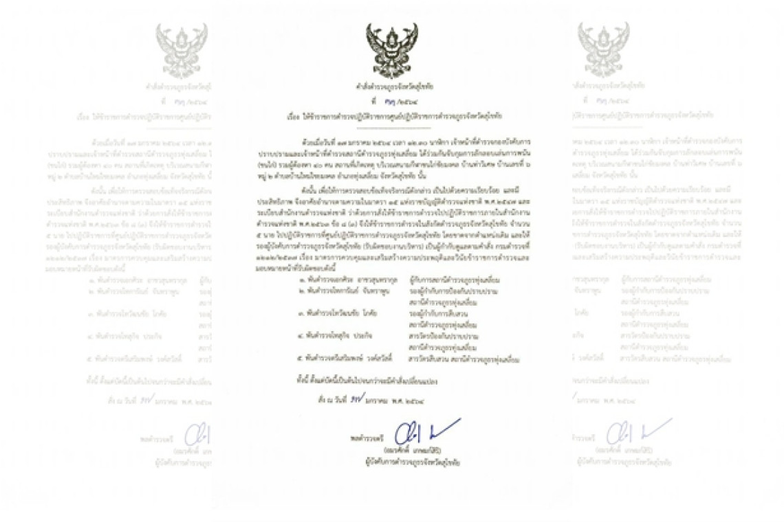 ดังนั้ เพื่อให้การตรวจสอบข้อก็จจริงกรณีดังกล่าว เป็นไปด้วยความเรียบร้อย และมีประสิทธิภาพ จึงอาศัยอำนาจตามความในมาตรา 15 แห่ราชบัญญัติตำรวจแห่งชาติ พ.ศ.2547 แสะ ระเบียบสำนักงานตำรวจแห่ชาติ ว่าด้วยการสั่งให้ข้าราชการตำรวจไปปฏิบัติราชการภายในสำนักงานตำรวจแห่ชาติ พ.ศ.2563 ข้อ 8 (3) จึงให้ข้าราชการตำรวจในสังกัดตำรวจภูธรจังหวัตสุโขทัย จำนวน 5 นาย ไปปฏิบัติราชการที่ศูนย์ปฏิบัติราชการตำรวจภูธรจัหวัดสุโขทัย คยขาดจากตำแหน่งเดิม และให้รองผู้บังคับการตำรวจภูธรจังหวัดสุโขทัย (รับผิดชอบงานบริหาร เป็นผู้กำกับดูแลตามคำสั่ง กรมตำรวจที่ 1212/2537 เรื่อง มาตรการควบคุและเสริมสร้างความประพฤติและวินัยข้าราชการตำรวจและมอบหมายหน้าที่รับผิดชอบดังนี้