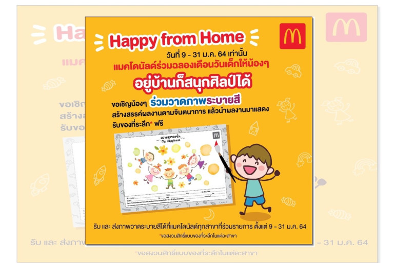 เรียนออนไลน์ได้ทฤษฎี วาดภาพระบายสีได้จินตนาการ แมคโดนัลด์ ชวนน้องๆ เพลิดเพลินไปกับกิจกรรม ‘Happy from Home’ อยู่บ้านก็สนุกศิลป์ได้ เพลิดเพลินกับการวาดภาพระบายสี แต่งแต้มจินตนาการ ความคิดสร้างสรรค์ พร้อมเติมเต็มช่วงเวลาดีๆ สร้างความผูกพันร่วมกันในครอบครัว น้องๆ สามารถรับภาพวาดระบายสี และส่งผลงาน พร้อมรับของที่ระลึกได้ที่ร้านแมคโดนัลด์ทุกสาขาที่ร่วมรายการ ทั้งหน้าร้าน และบริการไดร์ฟ ทรู ตั้งแต่วันนี้ – 31 มกราคม 2564 ดูรายละเอียดเพิ่มเติมได้ที่ www.facebook.com/mcthai