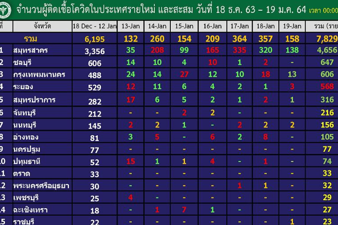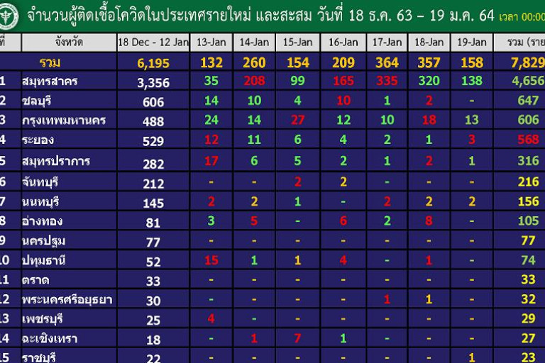 กทม.รายใหม่ยังเพิ่มเป็นอันดับ 2 ยอดรวมกว่า 600 มีสิทธิ์แซงที่ 2 ชลฯ-จันท์-อ่างทอง-นครปฐม-ปทุมฯ วันนี้รายใหม่เป็น 0 เมื่อวันที่ 19 ม.ค.64 กรมควบคุมโรค กระทรวงสาธารณสุข เผยจำนวนผู้ติดเชื้อโควิด-19 ในประเทศไทยรายใหม่และสะสม ตั้งแต่วันที่ 18 ธ.ค.63-19 ม.ค.64 โดยข้อมูลอัพเดตเมื่อวันที่ 19 ม.ค.64 เวลา 00.00 น. 10 อันดับจังหวัดพบผู้ติดเชื้อโควิดสูงสุด ประกอบด้วย อันดับ 1 สมุทรสาคร รายใหม่เพิ่มอีก 138 ยอดรวม 4,656 ราย อันดับ 2 ชลบุรี ไม่พบรายใหม่ ยอดรวม 647 ราย อันดับ 3 กทม. พบเพิ่มอีก 13 ยอดรวม 606 ราย อันดับ 4 ระยอง เพิ่มอีก 3 ยอดรวม 568 ราย อันดับ 5 สมุทรปราการ เพิ่มอีก 1 ยอดรวม 316 อันดับ 6 จันทบุรี ไม่มีผู้ป่วยเพิ่ม (3 วันติด) ยอดรวม 216 อันดับ 7 นนทบุรี เพิ่ม 2 ยอดรวม 156 อันดับ 8 อ่างทอง ไม่มีผู้ป่วยเพิ่ม ยอดรวม 105 อันดับ 9 นครปฐม ไม่มีผู้ป่วยเพิ่ม ยอดรวมคงที่ 77 อันดับ 10 ปทุมธานี ไม่มีผู้ป่วยเพิ่ม ยอดรวม 74