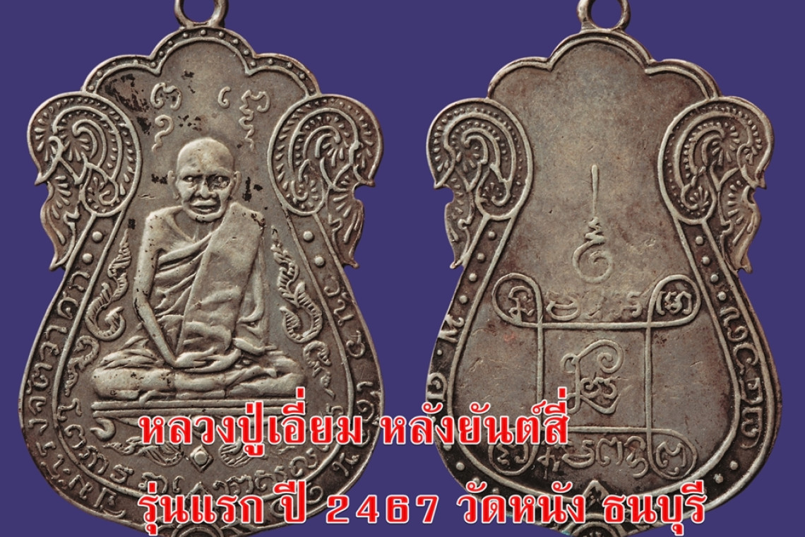 สัปดาห์พระเครื่อง / ราม วัชรประดิษฐ์ เหรียญปั๊มรูปเหมือนหลวงปู่เอี่ยม รุ่นแรก ยันต์สี่ ปี 2467 ถือเป็นครั้งแรกที่ หลวงปู่เอี่ยม สุวณฺณสโร หรือ ท่านเจ้าคุณเฒ่า อดีตเจ้าอาวาสวัดหนัง ท่านยอมอนุญาตให้มีการจัดสร้างเหรียญที่ระลึกขึ้น เพื่อแจกแก่ผู้ที่มีจิตศรัทธาร่วมบริจาคปัจจัยในการปฏิสังขรณ์ศาลาการเปรียญซึ่งชำรุดทรุดโทรมมาก จึงนับเป็นเหรียญรูปเหมือนรุ่นแรก ปัจจุบันได้รับการยกย่องให้เป็นหนึ่งในห้าเหรียญยอดนิยม ที่มีค่านิยมสูง หาดูหาเช่ายากเอาการ โดยเฉพาะเหรียญที่มีสภาพสมบูรณ์จริงๆ ผู้มีไว้ต่างหวงแหน พระภาวนาโกศล  หลวงปู่เอี่ยม ผู้สร้าง หลวงปู่เอี่ยม เป็นชาวบางขุนเทียนโดยกำเนิด เกิดเมื่อปี พ.ศ.2375 ในสมัยพระบาทสมเด็จพระนั่งเกล้าเจ้าอยู่หัว (รัชกาลที่ 3) เมื่อท่านอุปสมบทเป็นพระภิกษุ ได้ฉายา “สุวณฺณสโร” ท่านใฝ่ศึกษาร่ำเรียนจนมีความแตกฉานทั้งทางด้านวิปัสสนาธุระและพุทธาคม ท่านเป็นพระที่เคร่งในวัตรปฏิบัติและเป็นที่เคารพศรัทธาเลื่อมใสของชาวบ้านและพุทธศาสนิกชนทั่วไป ต่อมาได้รับการแต่งตั้งเป็นเจ้าอาวาสวัดหนังราชวรวิหาร และได้พัฒนาวัดจนเจริญรุ่งเรืองและเป็นที่รู้จักของพุทธศาสนิกชนทั้งใกล้ไกล ชื่อเสียงของท่านเลื่องลือขจรไกลมีศิษยานุศิษย์มากมาย ที่สำคัญ ล้นเกล้าฯ รัชกาลที่ 5 ทรงให้ความเคารพอย่างสูง หลวงปู่เอี่ยมมรณภาพในปี พ.ศ. 2469 สิริอายุ 94 ปี พรรษา 72 เนื้อหามวลสาร หลวงปู่เอี่ยมหลังยันต์สี่ หน้า หลวงปู่เอี่ยมหลังยันต์สี่ หลัง มีการจัดสร้าง ทั้ง เนื้อทองคำ เงิน และ ทองแดง อีกทั้งสร้างแบบพิเศษขึ้นอีกหลายรูปแบบ อาทิ ทำพื้นเงิน องค์พระฉลุด้วยทองคำดุนนูน, พื้นเงิน องค์พระฉลุเป็นนาค และ เหรียญทองคำลงยา เป็นต้น พุทธลักษณะ ลักษณะเป็นเหรียญรูปใบเสมา หูในตัว ขอบเหรียญทั้งด้านหน้าและด้านหลังแกะลวดลายกระหนกอย่างงดงาม ด้านข้างของขอบเหรียญเป็นแบบเลื่อย พิมพ์ด้านหน้า มีเพียงพิมพ์เดียว ภายในกรอบกนก เป็นรูปจำลองหลวงปู่เอี่ยมนั่งเต็มองค์ บนอาสนะขาสิงห์ ใต้โต๊ะและข้างแขนทั้งสองข้างมีลายกระหนกเล่นลายอุณาโลม เหนือศีรษะหลวงปู่มีอักขระ “พุทโธ” ด้านล่างใต้อาสนะขาสิงห์มีอักขระขอมเป็นชื่อท่าน คือ “ภาวนาโกศลเถระ” รอบเหรียญมีหนังสือไทยอ่านได้ว่า “วัน ๖ เดือน ๑๑ ปีมะโรง จัตวาศก” ส่วนพิมพ์ด้านหลัง แบ่งเป็น 2 พิมพ์ ในวงการจะเรียกตามจุดไข่ปลา ที่ข้างตัว พ.พาน และ เลข 7 ถ้ามี 4 จุด เรียก “ยันต์สี่ สี่จุด” แต่ถ้ามี 3 จุด เรียก “ยันต์สี่ สามจุด” นอกนั้นจะเหมือนกันหมดทั้งการเขียนอักขระและการวางตำแหน่งยันต์ ดังนี้ ค