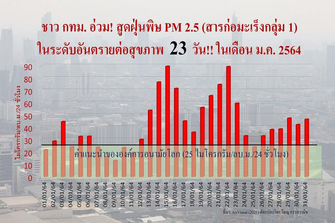 กทม.-ปริมณฑลค่าฝุ่น 2.5 อันตรายมากกว่าเมื่อวานรับเปิดเทอมวันแรก เหตุหลักเผากันหนักมากในจังหวัดใกล้เคียง รวมทั้งฝุ่นข้ามแดนจากกัมพูชา เมียนมา ระบุกทม.ช่วงเดือนแรกของปีนี้เจอฝุ่นพิษต่อเนื่องถึง 23 จาก 31 วัน ชี้คนไทยตายผ่อนส่ง รศ.ดร.วิษณุ อรรถวานิช อาจารย์ประจำคณะเศรษฐศาสตร์ มหาวิทยาลัยเกษตรศาสตร์ ผู้เชี่ยวชาญงานวิจัยด้านการเปลี่ยนแปลงสภาพภูมิอากาศและการเกษตร โพสต์ผ่านเฟซบุ๊กระบุ เช้านี้เผากันหนักมาก (1 ก.พ.64) ฝุ่นพิษ PM2.5 (สารก่อมะเร็งกลุ่ม 1) มีค่าในระดับอันตรายมากในกรุงเทพฯ และปริมณฑล! ภาคเหนือ กลาง ตะวันตก และตะวันออกก็หนักหลายพื้นที่ กรุงเทพและปริมณฑลค่าฝุ่นพิษสูงมากในระดับโคตรอันตรายหลายพื้นที่มากกว่าเมื่อวาน (สีม่วง) และมีระดับอันตรายมากต่อสุขภาพเกือบทุกพื้นที่ (สีแดง) หลายพื้นที่ในภาคเหนือ กลาง ตะวันตก และตะวันออก ก็หนักตามๆ กัน สาเหตุหลักของฝุ่นพิษในกรุงเทพฯ และปริมณฑล มาจากการเผาที่หนักมากในพื้นที่ใกล้เคียง และเผาในประเทศกัมพูชาและเมียนมาร์ วันนี้ไทยเผามากขึ้นกว่าเมื่อวาน กัมพูชา (4131 จุด) กับเมียนมาร์ (1992 จุด) พร้อมใจกันเผาทำสถิติสูงสุดใหม่ในปีนี้ วันนี้รวม 3 ประเทศ จำนวนจุดความร้อนทำสถิติสูงสุดใหม่ที่ 7018 จุด!! โดยฝุ่นจากการเผาถูกลมพัดมาผสมกับฝุ่นพิษในพื้นที่จากรถยนต์และโรงงานที่มีมากอยู่แล้ว วันนี้เปิดเรียนวันแรกหลังจากหยุดโควิด-19 ทำให้ฝุ่นจากรถยนต์เพิ่มขึ้น ปรากฏการณ์ฝาชีครอบต่ำเป็นปัจจัยสนับสนุนการเกิดมลพิษทางอากาศในวันนี้ ควรงดกิจกรรมการเผาในช่วงนี้เพื่อลดความรุนแรงต่อสุขภาพ กลุ่มเสี่ยง เด็ก คนสูงวัย และสตรีมีครรภ์ ควรงดกิจกรรมกลางแจ้งในช่วงนี้นะครับ อย่าลืมใส่หน้ากากอนามัยที่ป้องกันฝุ่นได้ให้เด็กๆ ก่อนออกจากบ้านและไม่ประมาทกับมัจจุราชมืด ขณะที่สรุปเดือนมกราคม 2564 ที่ผ่านมา ชาว กทม. อ่วม! สูดฝุ่นพิษ PM 2.5 (สารก่อมะเร็งกลุ่ม 1) ในระดับอันตรายต่อสุขภาพกัน 23 วัน!! จาก 31 วัน ค่าฝุ่นพิษไม่ลดลงเมื่อเทียบกับปีที่แล้ว คงตายผ่อนส่งกันยาวๆ ถ้าไม่มีการแก้ไขปัญหาที่เป็นรูปธรรม รักษาสุขภาพกันนะครับ ท่านใดสนใจเป็นส่วนหนึ่งในการแก้ปัญหามลพิษทางอากาศ สามารถร่วมลงชื่อสนับสนุนร่างพระราชบัญญัติกำกับดูแลการจัดการอากาศสะอาดเพื่อสุขภาพแบบบูรณาการ ได้ตามลิ้งค์นี้นะครับ https://thailandcan.org/ร่วมลงชื่อเสนอร่าง-พ.ร.บ.