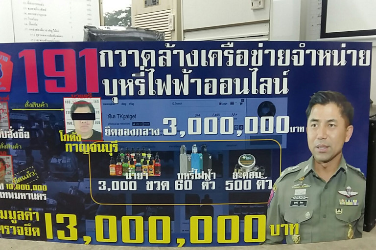 โดยลูกค้าที่ชื่นชอบนิยมสูบบุหรีไฟฟ้าจะสั่งซื้อ โดยให้นายธีรวัฒน์ เป็นแอดมีนในการดูแลโดยให้ลูกค้าโอนเงินเข้าบัญชีธนาคารแห่งหนึ่ง ของนายขจรศักดิ์ ศิลปสิทธิ์ ชื่อหมายเลขบัญชี 029-874 8444 และจะมอบหน้าที่ให้นายขจรศักดิ์ กับนางสาวศิริพร เช้าชื่น ทำการบรรจุหีบห่อ จัดส่งของลูกค้าทางไปรษณีย์ ซึ่งเจ้าหน้าที่ตำรวจจะติดตามสืบสวนขยายผลจับกุมต่อไป อยากขอฝากเตือนประชาชนหากผู้ใดมีบุหรี่ไฟฟ้าไว้ในครอบครอง ถือเป็นเรื่องผิดกฎหมาย