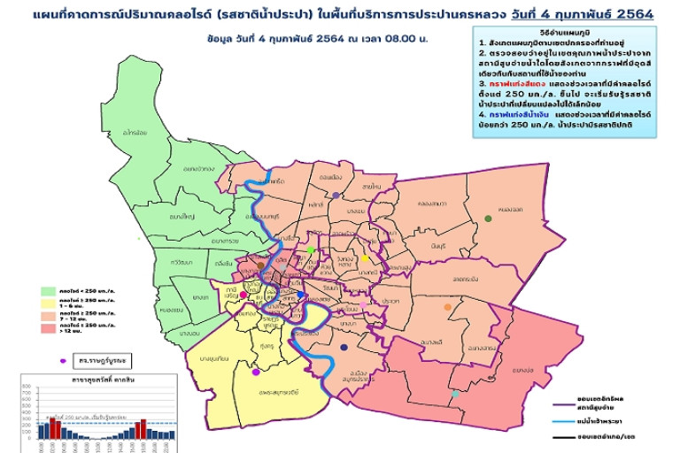 การประปานครหลวง (กปน.) รายงานภาพรวมการคาดการณ์น้ำประปาในพื้นที่กรุงเทพมหานคร นนทบุรี และสมุทรปราการ วันที่ 4 ก.พ.64 เวลา 08.00 น. โดยในพื้นที่ที่มีช่วงกราฟสีแดง ค่าคลอไรด์จะเกินกว่า 250 มิลลิกรัมต่อลิตร ส่งผลต่อการรับรู้รสชาติประมาณ 2-12 ชั่วโมง ส่วนช่วงเวลาอื่น (ช่วงกราฟสีน้ำเงิน) น้ำประปามีรสชาติปกติ ควรสำรองน้ำไว้บริโภค