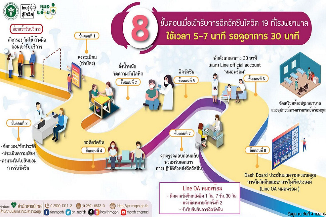 สถาบันบำราศนราดูรต้นแบบ เซ็ตระบบ 8 ขั้นตอน ตั้งแต่คัดกรองถึงกลับบ้าน รวมใช้เวลา 37 นาที และแอดไลน์ “หมอพร้อม” ติดตามผลหลังฉีด 1,7, 30 วัน นัดเข็ม 2