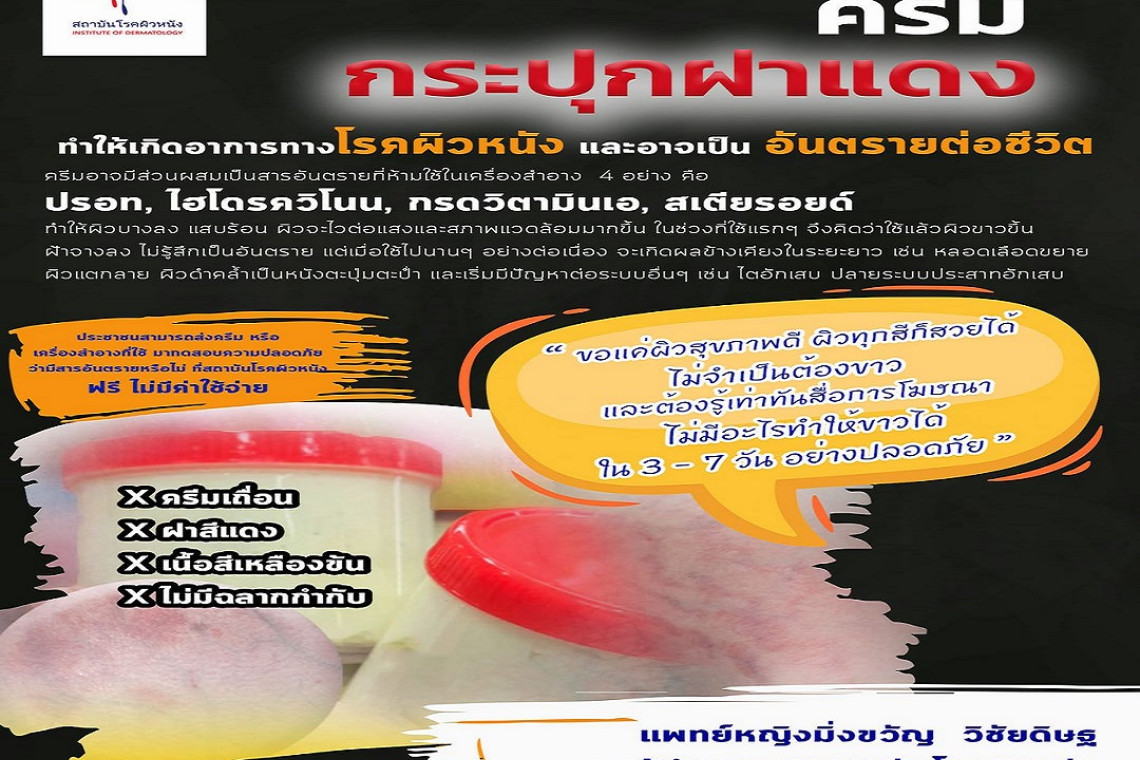 นพ.สมศักดิ์ อรรฆศิลป์ อธิบดีกรมการแพทย์ กล่าวว่า จากที่โลกออนไลน์มีการแชร์เตือนภัยอันตรายครีมเถื่อนหรือที่เรียกกันว่า “ครีมฝาแดง” ซึ่งเป็นลักษณะครีมกระปุกฝาสีแดง เนื้อสีเหลืองข้น ตัวกระปุกไม่มียี่ห้อ หรือฉลากใดๆ กำกับ กำลังได้รับความนิยมจากวัยรุ่นบนแอป Tiktok โดยมีการอ้างสรรพคุณส่งต่อกันว่าใช้แล้วผิวขาวใสใน 3-7 วัน ขอให้ประชาชนระมัดระวังอันตรายจากการใช้ครีมดังกล่าว เพราะเป็นสาเหตุที่ทำให้เกิดอาการทางโรคผิวหนังได้ในระยะยาว และเป็นอันตรายต่อชีวิต