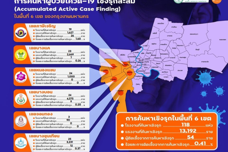 กรุงเทพมหานคร โดยสำนักงานประชาสัมพันธ์ รายงานผลการค้นหาผู้ป่วยติดเชื้อโควิด-19 ในพื้นที่เสี่ยง (Accumulate Ative Case Finding ) ของโรงงาน ในพื้นที่ 6 เขต ได้แก่ ภาษีเจริญ บางแค หนองแขม บางบอน จอมทอง และบางขุนเทียน
