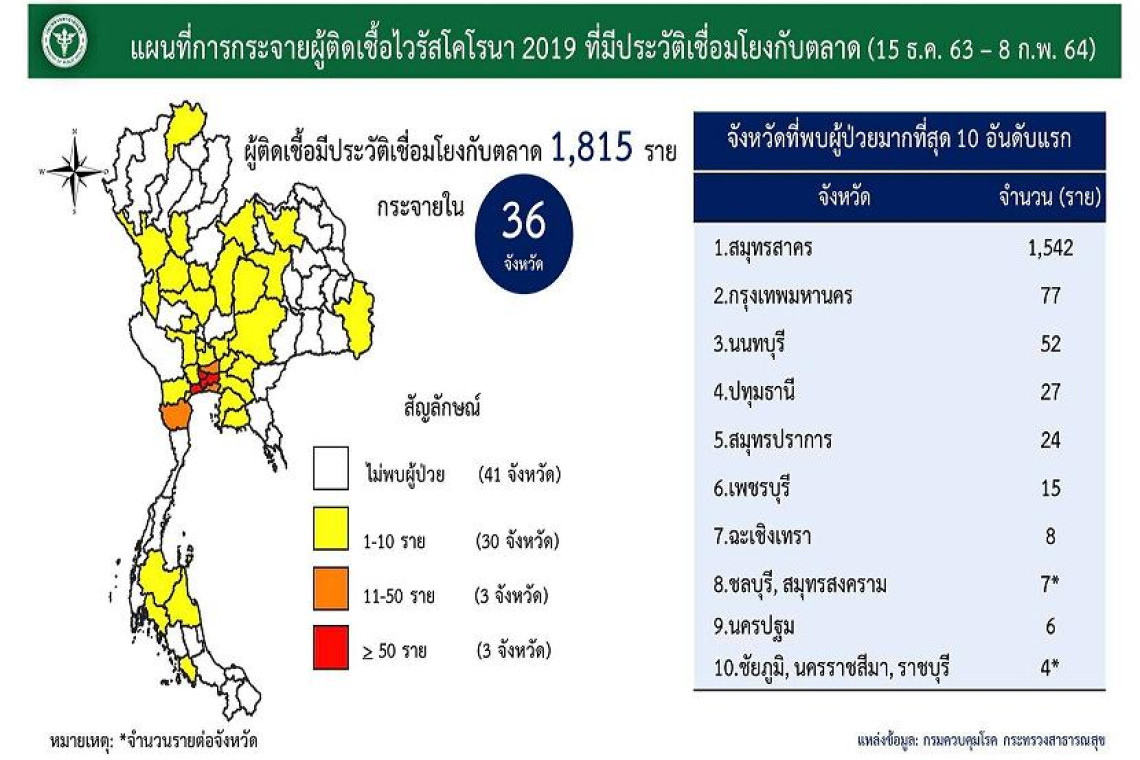กรมควบคุมโรค กระทรวงสาธารณสุข รายงานข้อมูลผู้ป่วยจากการติดเชื้อโควิด-19 ที่มีประวัติเชื่อมโยงกับตลาด 1,815 คน กระจายใน 36 จังหวัด (ตั้งแต่ 15 ธ.ค.63-8 ก.พ.64)