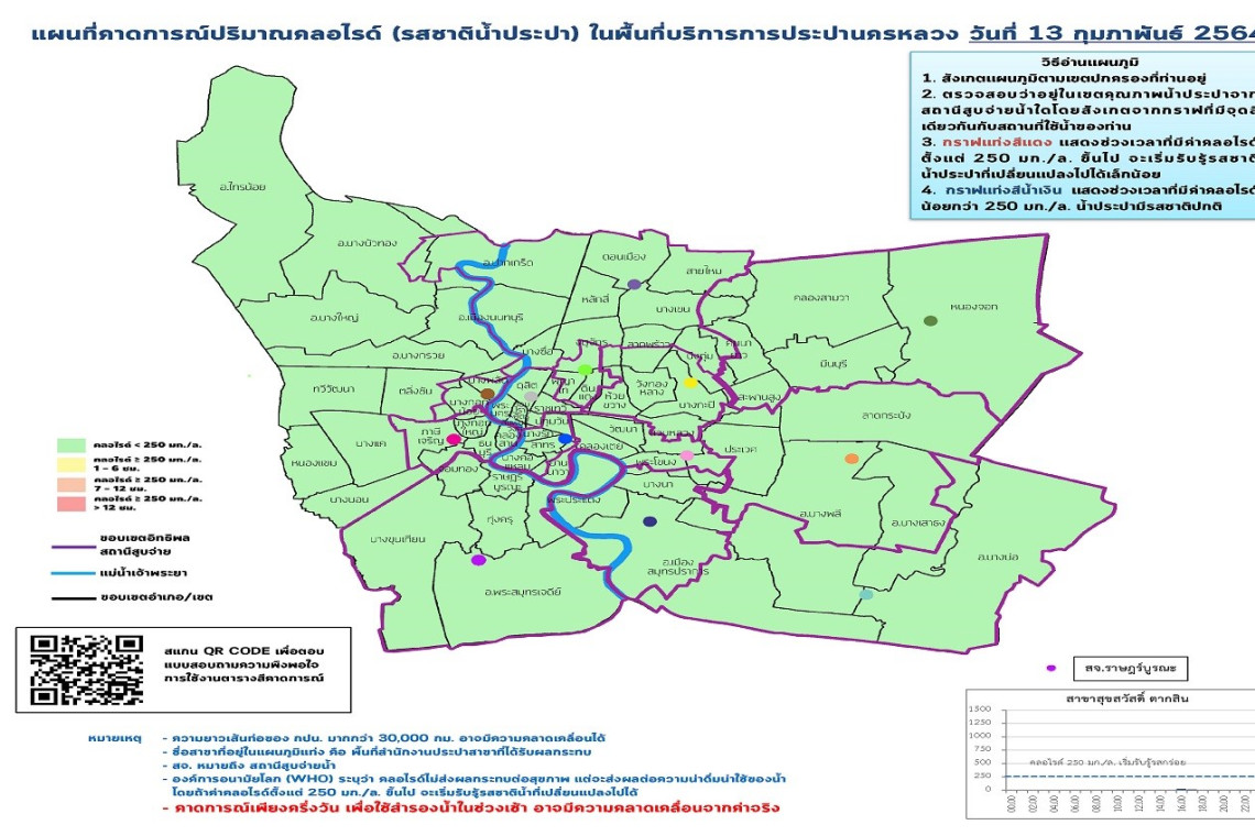 การประปานครหลวง (กปน.) คาดการณ์ภาพรวมน้ำประปา วันที่ 13 ก.พ.64 น้ำประปารสชาติปกติตลอดวัน ทั่วพื้นที่กรุงเทพมหานคร นนทบุรี และสมุทรปราการ (คาดการณ์ ณ วันที่ 12 ก.พ.64 เวลา 15.00 น.) โดยทุกพื้นที่มีช่วงกราฟสีน้ำเงิน ค่าคลอไรด์ น้อยกว่า 250 มิลลิกรัม/ลิตร ค่าความนำไฟฟ้า น้อยกว่า 1,200 ไมโครซีเมนต์/เซนติเมตร ไม่ส่งผลต่อการรับรู้รสชาติ แนะนำประชาชน สำรองน้ำไว้บริโภค