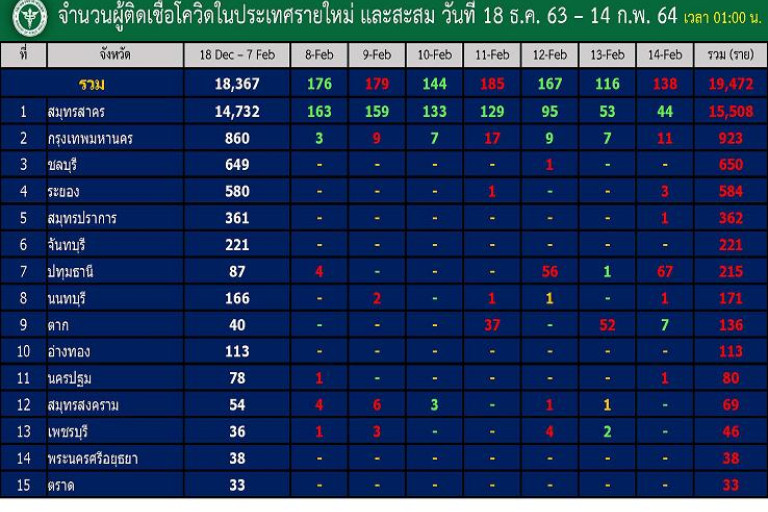 ทั้งนี้ รายงานข้อมูลวันที่ 14 ก.พ.64 พบผู้ติดเชื้อรายใหม่ใน 10 จังหวัด ประกอบด้วย