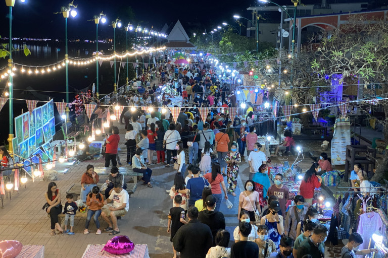 บรรยากาศการท่องเที่ยวยามค่ำคืนในช่วงวันหยุดยาว ที่ตลาดแคมโขงหรือถนนคนเดินริมโขง ภายในเขตเทศบาลเมืองหนองคายหนองคาย ที่เริ่มจากบริเวณถนนริมเขื่อนป้องกันตลิ่ง จากท่าเรือหายโศก จนถึงตลาดท่าเสด็จ ที่ปกติจะมีร้านค้าทั้ง 2 ฝั่งกว่า 500 ร้าน ระยะทางประมาณ 1 กม. ที่เทศบาลเมืองหนองคาย จัดให้มีขึ้นทุกคืนวันเสาร์เวลาตั้งแต่ เวลา 16.00 – 22.00 น. วันนี้ (13 ก.พ. 64) คึกคักกว่าหลายสัปดาห์ที่ผ่านมา เนื่องจากเป็นวันหยุดยาวติดต่อกันหลายวัน อีกทั้งยังเป็นวันก่อนถึงวันแห่งความรัก มีนักท่องเที่ยวทั้งชาวไทยและชาวต่างประเทศ ออกมาเดินจับจ่ายซื้อหาสินค้า พักผ่อน ถ่ายรูปกับทิวทัศน์ริมฝั่งโขงยามค่ำคืน และรับประทานอาหารชมวิวแม่น้ำโขงกันเป็นจำนวนมาก ภายใต้มาตรการในการป้องกันการแพร่ระบาดของไวรัสโควิด-19 เริ่มตั้งแต่การตรวจคัดกรองก่อนเข้าภายใน “ตลาดแคมของ” ที่มีการตรวจวัดอุณหภูมิ ให้สวมหน้ากากอนามัย และมีการจัดร้านในเว้นระยะห่างมากขึ้น