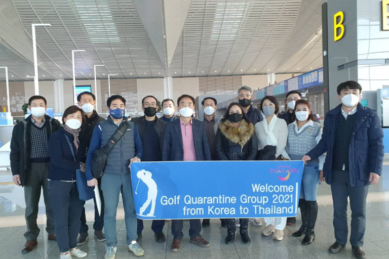 นางจิราณี พูนนายม ผู้อำนวยการการท่องเที่ยวแห่งประเทศไทย (ททท.) สำนักงานโซล กล่าวว่า ในส่วนของ Golf Quarantine นั้น ขณะนี้ ททท.สนง.โซล ได้ทำ Golf Webinar เพื่อประชาสัมพันธ์เรื่อง Golf Quarantine ในประเทศไทย ซึ่งขณะนี้อยู่ในระหว่างหารือกับบริษัทอารีรัง ซึ่งเป็น Golf Travel Agent รายใหญ่ของเกาหลี เสนอขายแพ็คเกจ Golf Quarantine เพื่อให้เกิดการเดินทางไปยังประเทศไทย ล่าสุด วันนี้ (18 ก.พ.64) เวลา 17.00 น. การท่องเที่ยวแห่งประเทศไทย สำนักงานโซล ร่วมส่งนักกอล์ฟ ซึ่งเป็น Golf Quarantine กลุ่มแรกจากเกาหลี เดินทางมาเล่นกอล์ฟและท่องเที่ยวระยะยาวยังประเทศไทย จำนวน 41 คน โดยสายการบินโคเรียนแอร์ เที่ยวบินที่ KE653 19.05 น.จากเกาหลี จะเดินทางถึงประเทศไทยเวลา 23.20 น.  ซึ่งในโอกาสนี้ ททท.ได้มอบ Spa Vouchers และถ่ายภาพร่วมกับ นายซู-เฮ ลี   ประธาน สนามกอล์ฟอาทิตยาและคณะนักกอล์ฟ ที่ สนามบินนานาชาติอินชอน สาธารณรัฐเกาหลี