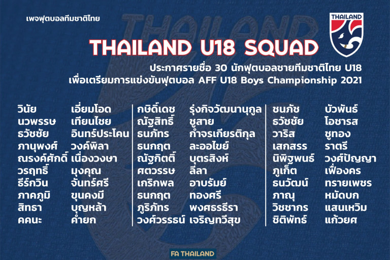 สมาคมกีฬาฟุตบอลแห่งประเทศไทย ในพระบรมราชูปถัมภ์ ทำการประกาศรายชื่อ 30 นักฟุตบอลชายทีมชาติไทย รุ่นอายุไม่เกิน 18 ปี เข้าเเคมป์เก็บตัวครั้งที่ 1 ระหว่างวันที่ 1-7 มีนาคม 2564 ณ ศูนย์พัฒนาศักยภาพกีฬา ภายในมหาวิทยาลัยกรุงเทพธนบุรี เพื่อเตรียมความพร้อมสำหรับการแข่งขันฟุตบอล AFF U18 Boys Championship 2021 สำหรับรายชื่อนักกีฬาฟุตบอลทีมชาติไทยรุ่นอายุไม่เกิน 18 ปี ทั้ง 30 คนมีรายชื่อดังต่อไปนี้ 1. วินัย เอี่ยมโอด สโมสร บุรีรัมย์ ยูไนเต็ด 2. นวพรรษ เทียนไชย สโมสร บุรีรัมย์ ยูไนเต็ด 3. ธวัชชัย อินทร์ประโคน สโมสร บุรีรัมย์ ยูไนเต็ด 4. ภานุพงศ์ วงค์พิลา สโมสร บุรีรัมย์ ยูไนเต็ด 5. ณรงค์ศักดิ์ เนื่องวงษา สโมสร บุรีรัมย์ ยูไนเต็ด 6. วรฤทธิ์ มุงคุณ สโมสร บุรีรัมย์ ยูไนเต็ด 7. ธีร์กวิน จันทร์ศรี โรงเรียนอัสสัมชัญธนบุรี 8. ภาคภูมิ ขุนคงมี โรงเรียนอัสสัมชัญธนบุรี 9. สิทธา บุญหล้า โรงเรียนอัสสัมชัญธนบุรี 10. คคนะ คำยก โรงเรียนอัสสัมชัญธนบุรี 11. กษิดิ์เดช รุ่งกิจวัฒนานุกูล โรงเรียนอัสสัมชัญธนบุรี 12. ณัฐสิทธิ์ ชูสาย สโมสร วัดโบสถ์ ซิตี้ 13. ธนภัทร กำจรเกียรติกุล สโมสร ราชบุรี มิตรผล เอฟซี 14. ธนกฤต ละออไขย์ สโมสร บีจี ปทุม ยูไนเต็ด 15. ณัฐกิตติ์ บุตรสิงห์ สโมสร บีจี ปทุม ยูไนเต็ด 16. ยศตวรรษ ลีลา สโมสร บีจี ปทุม ยูไนเต็ด 17. เกริกพล อาบรัมย์ สโมสร บีจี ปทุม ยูไนเต็ด 18. ธนกฤต ทองศรี สโมสร บีจี ปทุม ยูไนเต็ด 19. ภูริภัทร พงศธรธีรา สโมสร เอสซีจี เมืองทอง ยูไนเต็ด 20. วงศ์วรรธน์ เจริญทวีสุข โครงการ Fox Hunt 21. ชนภัช บัวพันธ์ โครงการ Fox Hunt 22. ธวัชชัย โอชารส โครงการ Fox Hunt 23. วาริส ชูทอง โครงการ Fox Hunt 24. เสกสรร ราตรี โครงการ Fox Hunt 25. นิพิฐพนธ์ วงศ์ปัญญา โครงการ Fox Hunt 26. ภูเก็ต เฟื่องคร โครงการ Fox Hunt 27. ธนวัฒน์ ทรายเพชร โครงการ Fox Hunt 28. ภาณุ หมัดบก โครงการ Fox Hunt 29. วิชชากร แสนเหวิม โครงการ Fox Hunt 30. ชิติพัทธ์ แก้วยศ พีทีที อะคาเดมี สำหรับนักกีฬาที่มีรายชื่อดังกล่าวจะต้องมารายงานตัว ณ ศูนย์พัฒนาศักยภาพกีฬา ภายในมหาวิทยาลัยกรุงเทพธนบุรี ในวันจันทร์ที่ 1 มีนาคม 2564 เวลา 15.00 น. ซึ่งจะต้องดำเนินการตรวจหาเชื้อไวรัสโควิด-19 ก่อนทำการฝึกซ้อม เพื่อให้เป็นไปตามมาตรการผ่อนปรนกิจการ และกิจกรรมด้านการกีฬาเพื่อป้องกันการแพร่ระบาดของโรคโควิด-19