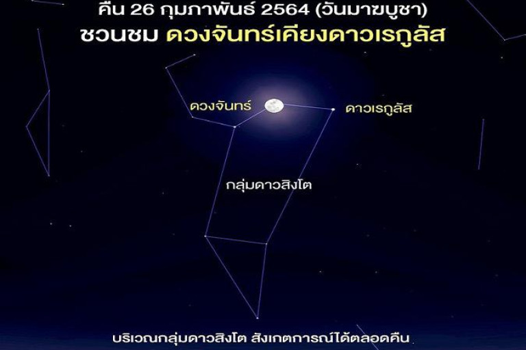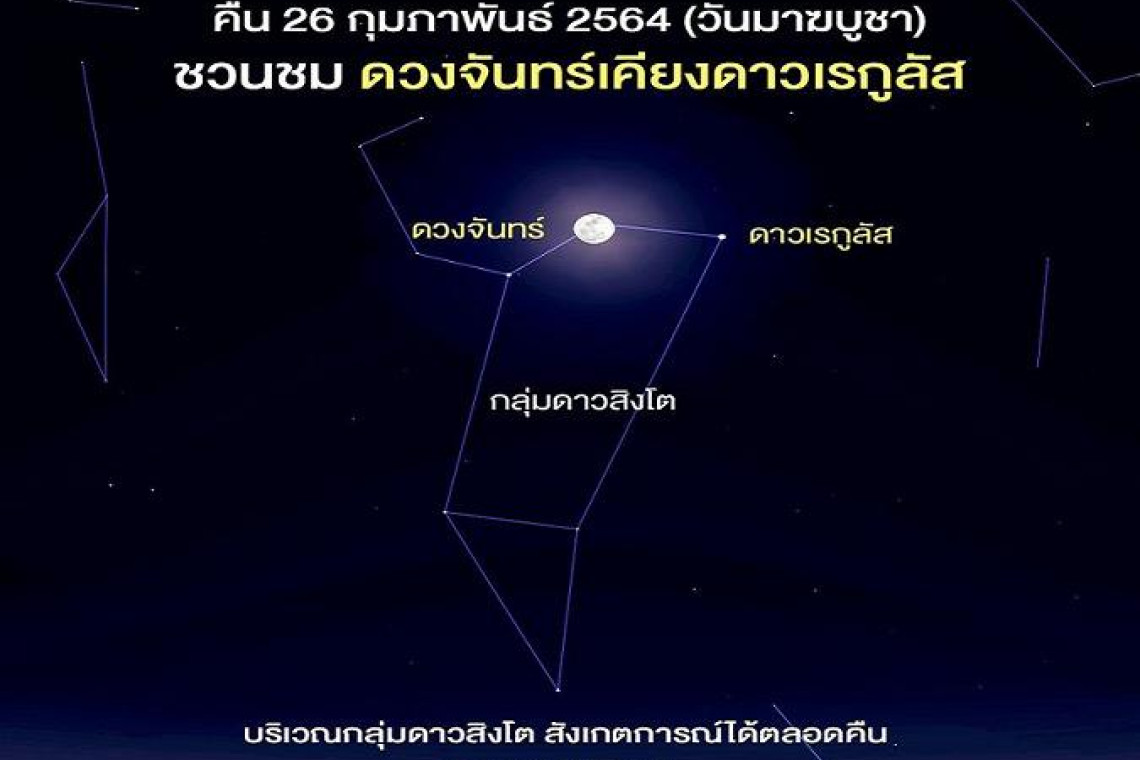 NARIT สถาบันวิจัยดาราศาสตร์แห่งชาติ โพสต์ผ่านเฟซบุ๊กระบุ “26 ก.พ. 64 #วันมาฆบูชา ชวนชม #ดวงจันทร์เคียงดาวเรกูลัส สังเกตการณ์ได้ตลอดทั้งคืน