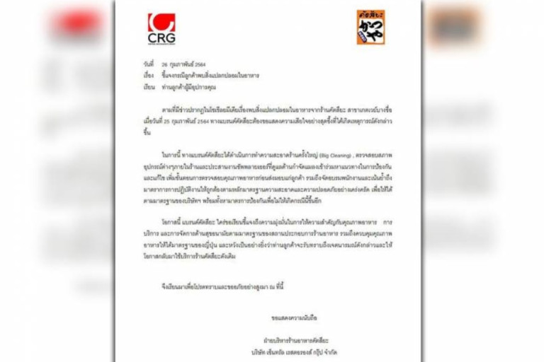 ล่าสุด ฝ่ายบริหารร้านอาหารคัตสึยะ บริษัท เซ็นทรัล เรสเตอรองส์ กรุ๊ป จำกัด ได้ทำหนังสือชี้แจงกรณีดังกล่าวระบุว่า ตามที่มีข่าวปรากฏในโซเชียลมีเดียเรื่องพบสิ่งแปลกปลอมในอาหารจากร้านคัตสึยะ สาขาเกตเวย์บางซื่อ เมื่อวันที่ 25 ก.พ. 2564 ทางแบรนด์คัตสึยะต้องขอแสดงความเสียใจอย่างสุดซึ้งที่ได้เกิดเหตุการณ์ดังกล่าวขึ้น