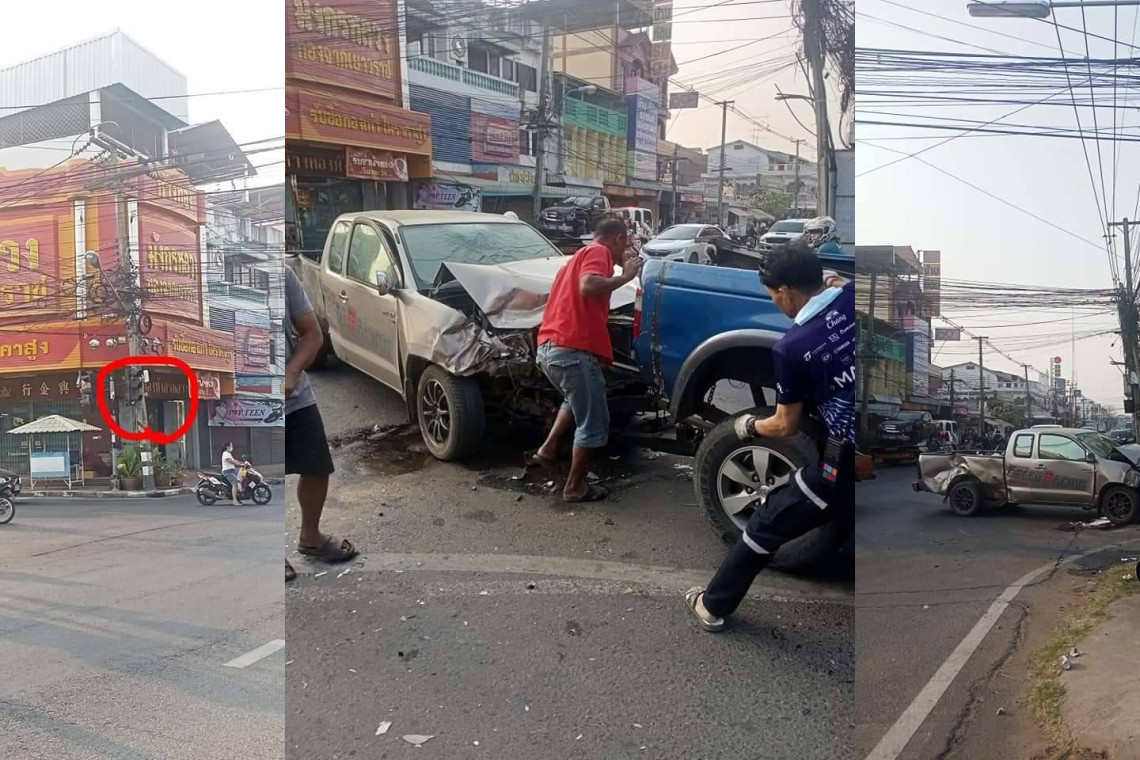 โดยในคลิปเป็นอุบัติเหตุที่เกิดขึ้นช่วงเวลา 06.58 น. วันที่ 28 ก.พ.2564 ที่ผ่านมา โดยรถยนต์กระบะคันสีดำขับมาจากทางตลาดทองมุ่งหน้าจะไปทางตลาดคลองถมหนองแปบ อีกคันเป็นกระบะ สีบรอนด์ทองวิ่งมาจากทาง บขส.มุ่งหน้าจะไปทางโค้งหนองปรือ แต่พอถึงสี่แยกสัญญาณไฟเขียวกลับขึ้นพร้อมกันทำให้รถกระบะทั้ง 2 คัน พุ่งชนประสานงากันอย่างเต็มแรง ก่อนที่กระบะคันสีดำจะเสียหลักไปพุ่งชนเสาสัญญาณไฟจราจรพังเสียหายด้วย ขณะที่รถกระบะทั้ง 2 คันก็มีสภาพพังเสียหายเช่นกันแต่เคราะห์ดีที่คนขับบาดเจ็บเล็กน้อย ต่อมาช่วงประมาณเที่ยงของวันที่ 1 มี.ค. 2564 เป็นรถเก๋งกับรถยนต์กระบะชนประสานงากัน และรถพังเสียหายทั้ง 2 คันเช่นกัน