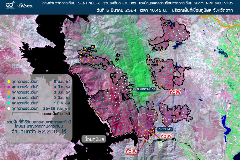 กระทรวงการอุดมศึกษา วิทยาศาสตร์ วิจัยและนวัตกรรม โดยสำนักงานพัฒนาเทคโนโลยีอวกาศและภูมิสารสนเทศ (องค์การมหาชน) หรือ GISTDA เผยภาพจากดาวเทียม SENTINEL-2 พบพื้นที่เผาไหม้บริเวณโดยรอบเขื่อนภูมิพล จ.ตาก กว่า 52,200 ไร่ และปรากฏภาพหัวไฟที่ยังคงลุกไหม้กระจายอยู่หลายจุด