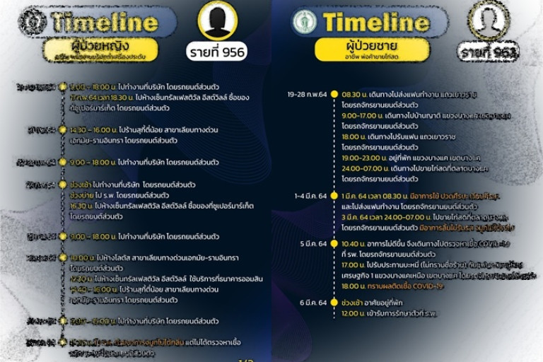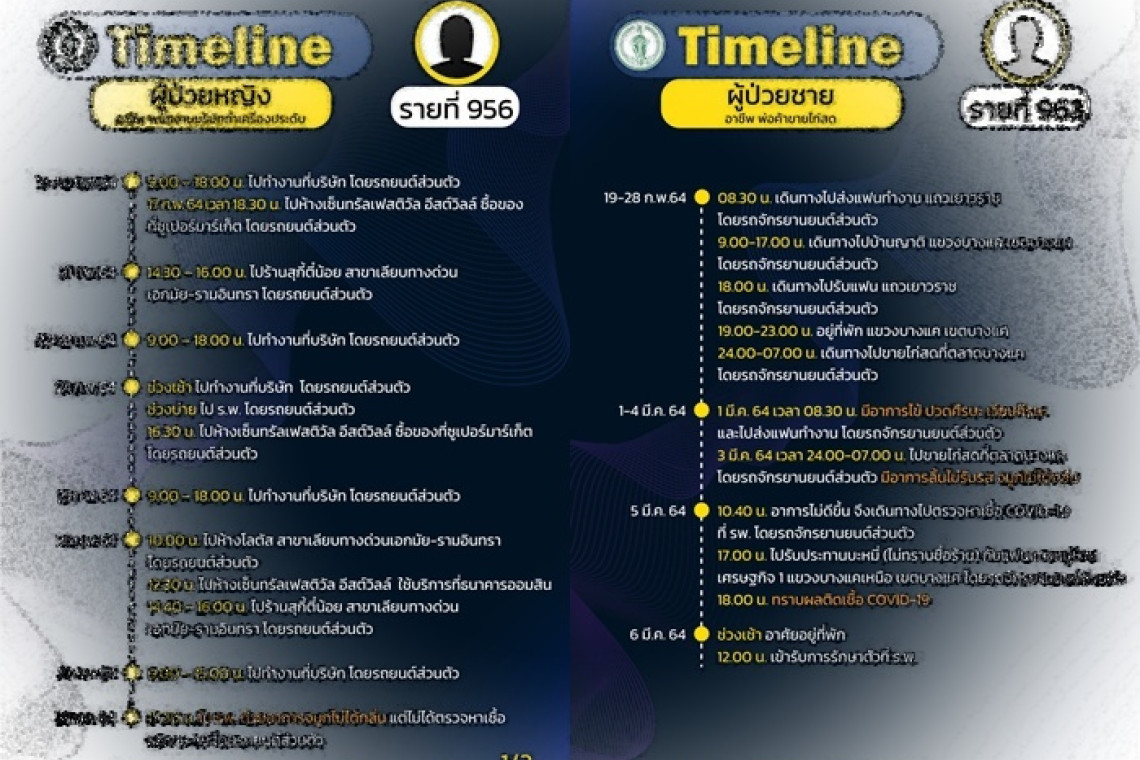 กรุงเทพมหานคร รายงานพบผู้ติดเชื้อ ตั้งแต่วันที่ 20 ธ.ค. 63 - 11 มี.ค. 64 รวม 1,006 ราย Timeline แถลงไปแล้ว 946 ราย วันนี้ มี Timeline ผู้ติดเชื้อที่อยู่ใน กทม. ซึ่งได้สอบสวนโรคแล้วเสร็จเพิ่มอีก 20 ราย (947-966) ทั้งนี้ พบเคสที่มีประวัติเดินทางไปในสถานที่ชุมชน ประกอบด้วย รายที่ 956 พนักงานบริษัทเครื่องประดับ มีประวัติไปห้างเซ็นทรัล เฟสติวัล อีสต์วิลล์ ร้านสุกี้ตี๋น้อยเลียบด่วนรามอินทรา รายที่ 963 ขายไก่สดในตลาดบางแค รายที่ 964 พนักงานขายถ้วยชามในตลาดบางแค รายที่ 962 ขายปลาแดดเดียวในตลาดบางแค