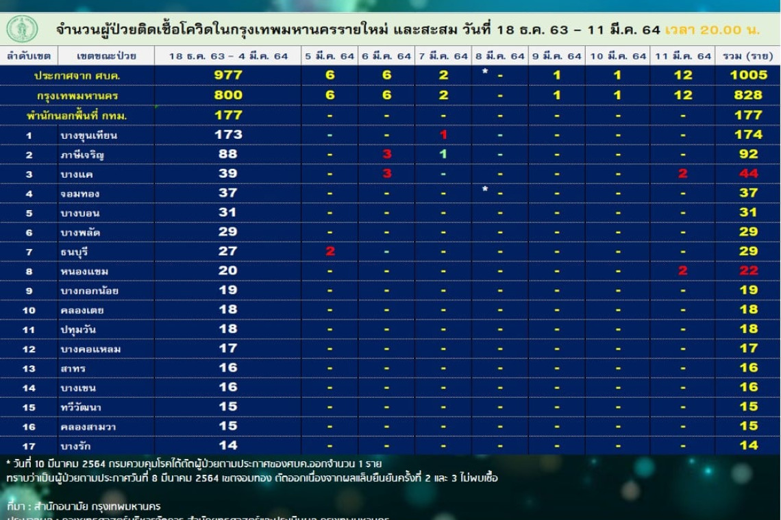 กรุงเทพมหานคร รายงานข้อมูลจำนวนผู้ป่วยติดเชื้อโควิด-19 รายใหม่และสะสม ตั้งแต่วันที่ 18 ธ.ค.63-11 มี.ค.64 เวลา 20.00 น. โดย 10 อันดับเขตพบผู้ป่วยติดเชื้อสูงสุด ดังนี้ อันดับ 1 เขตบางขุนเทียน 174 คน อันดับ 2 เขตภาษีเจริญ 92 คน อันดับ 3 เขตบางแค 44 คน อันดับ 4 เขตจอมทอง 37 คน อันดับ 5 เขตบางบอน 31 คน อันดับ 6 เขตบางพลัด 29 คน อันดับ 7 เขตธนบุรี 29 คน อันดับ 8 เขตหนองแขม 22 คน อันดับ 9 เขตบางกอกน้อย 19 คน อันดับ 10 เขตคลองเตย 18 คน
