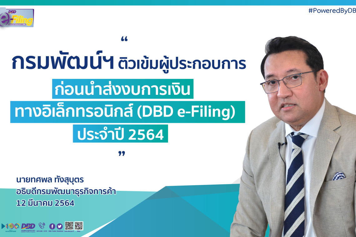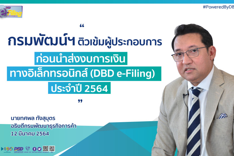 กรมพัฒนาธุรกิจการค้า เตรียมติวเข้มหลักสูตรเพิ่มประสิทธิภาพการรับงบการเงินและบัญชีรายชื่อผู้ถือหุ้นทางอิเล็กทรอนิกส์ (DBD e-Filing) ปี 2564 อบรมผ่านระบบออนไลน์ (Zoom) เสริมความรู้ สร้างความเข้าใจในการนำส่งงบการเงินได้อย่างถูกต้องครบถ้วน ภายในระยะเวลาที่กฎหมายกำหนด นายทศพล ทังสุบุตร อธิบดีกรมพัฒนาธุรกิจการค้า เปิดเผยว่า จากนโยบายเว้นระยะห่างทางสังคม (social distancing) เพื่อลดความเสี่ยงการระบาดของโควิด-19 หลายองค์กรต้องหาวิธีและเครื่องมือเพื่อตอบโจทย์รูปแบบการทำงานที่เปลี่ยนไป การประชุมแบบ e-Meeting ได้รับความนิยมเพิ่มขึ้นอย่างแพร่หลาย กรมพัฒนาธุรกิจการค้าจึงมีมาตรการรองรับเพื่อให้สอดรับกับยุควิถีใหม่ (New Normal) ด้วยการอบรมผ่านระบบออนไลน์ โดยในปี 2564 กรมฯได้จัดอบรม “โครงการเพิ่มประสิทธิภาพการรับงบการเงินและบัญชีรายชื่อผู้ถือหุ้นทางอิเล็กทรอนิกส์ (DBD e-Filing) ประจำปี 2564” ผ่านระบบออนไลน์ ให้กับผู้มีหน้าที่จัดทำบัญชี ผู้ทำบัญชี ผู้สอบบัญชีรับอนุญาต สมาคมการค้าและหอการค้า เพื่อเสริมสร้างความรู้ความเข้าใจในการนำส่งงบการเงิน ผ่านทางอิเล็กทรอนิกส์ (DBD e-Filing) ได้อย่างถูกต้อง ครบถ้วน ภายในระยะเวลาที่กฎหมายกำหนด อีกทั้งยังช่วยให้ผู้ทำบัญชีและผู้สอบบัญชีสามารถวางแผนงานได้ โดยสามารถจัดเตรียมงบการเงินและนำส่งต่อกรมได้ทันเวลา หากวางแผนได้ดีแล้วก็ย่อมจะเป็นประโยชน์ต่อบริษัทเอง สำหรับผู้เข้าร่วมอบรมจะได้รับความรู้ต่างๆที่จำเป็นในการยื่นงบการเงินประกอบด้วย 1.กฎหมาย/ระเบียบ/หลักเกณฑ์และวิธีการยื่นงบการเงินและบัญชีรายชื่อผู้ถือหุ้น 2.การยื่นงบการเงินประจำปี 2564 Excel V 2.0 3.ยื่นงบการเงินอย่างไรไม่ให้บกพร่อง 4.การยื่นบัญชีรายชื่อผู้ถือหุ้น 5.การตรวจสอบผลการยื่นงบการเงินและบัญชีรายชื่อผู้ถือหุ้น ทั้งนี้ กรมฯ ได้นำระบบ DBD e-Filing มาใช้ในการให้ผู้ประกอบธุรกิจนำส่งงบการเงินตั้งแต่ปี 2558 โดยมีผู้นำส่งงบการเงินผ่านระบบ DBD e-Filing แล้วกว่าร้อยละ 98 ซึ่งก่อให้เกิดประโยชน์ด้านการสนับสนุนข้อมูลแก่หน่วยงานภาครัฐ เพื่อใช้ในการตรวจสอบและกำกับดูแลธุรกิจ รวมถึงการนำข้อมูลไปใช้ในการวางแผนและกำหนดนโยบายในการส่งเสริมและพัฒนาธุรกิจที่ส่งผลกระทบต่อเศรษฐกิจระดับประเทศ ให้บริการข้อมูลธุรกิจออนไลน์โดยเชื่อมต่อข้อมูลนิติบุคคลระหว่างหน่วยงานภาครัฐผ่านระบบอิเล็กทรอนิกส์มีความสะดวก รวดเร็วมากขึ้น รวมถึงเป็นประโยชน์อย่างยิ่งต่อการพัฒนาประเทศ และเพิ่มประสิทธิภาพในการแข่งขันทางการค้าให้มีความเข้มแข็งทัดเทียมระดับสากล โดยขณะนี้มีผู้สนใจเข้าร่วมกิจกิจ